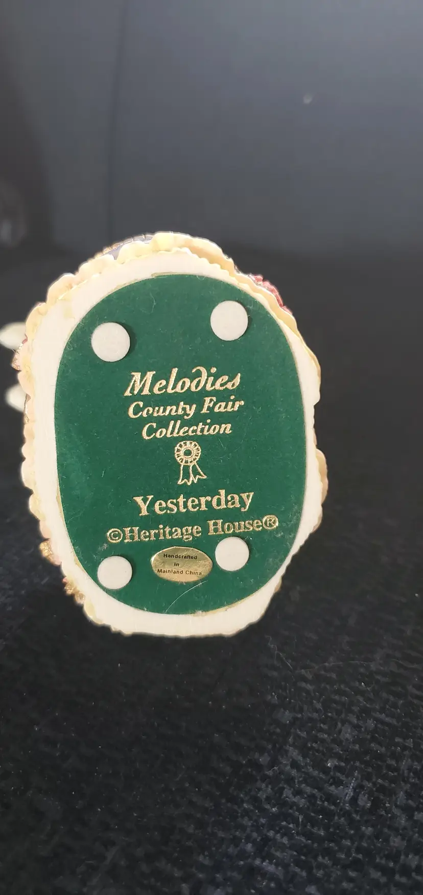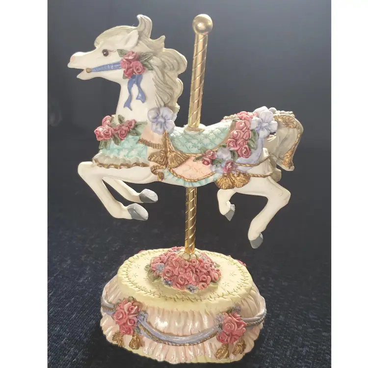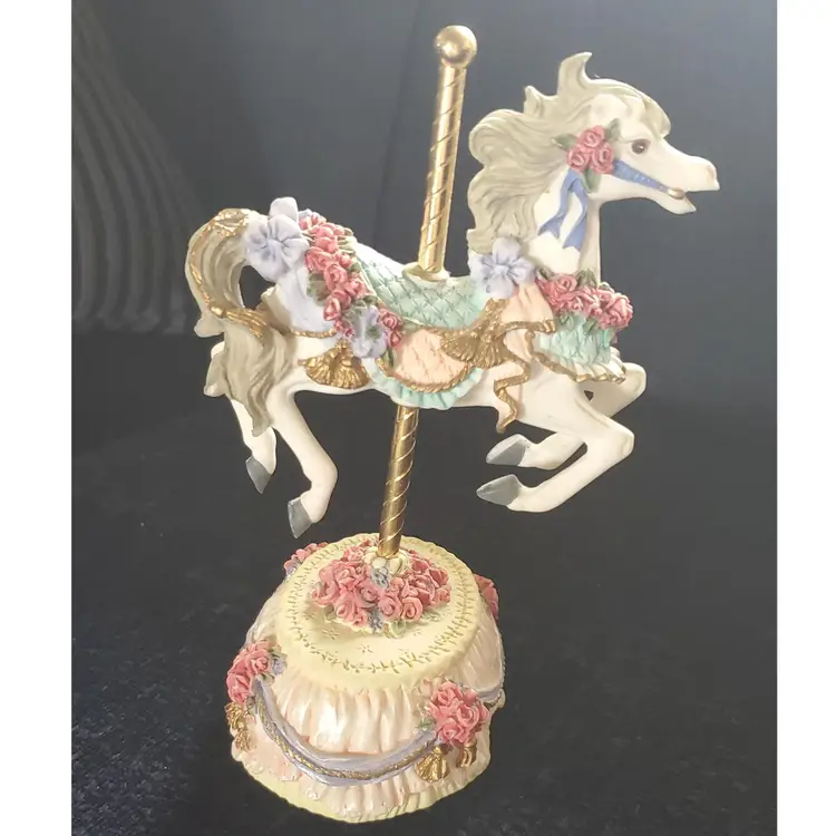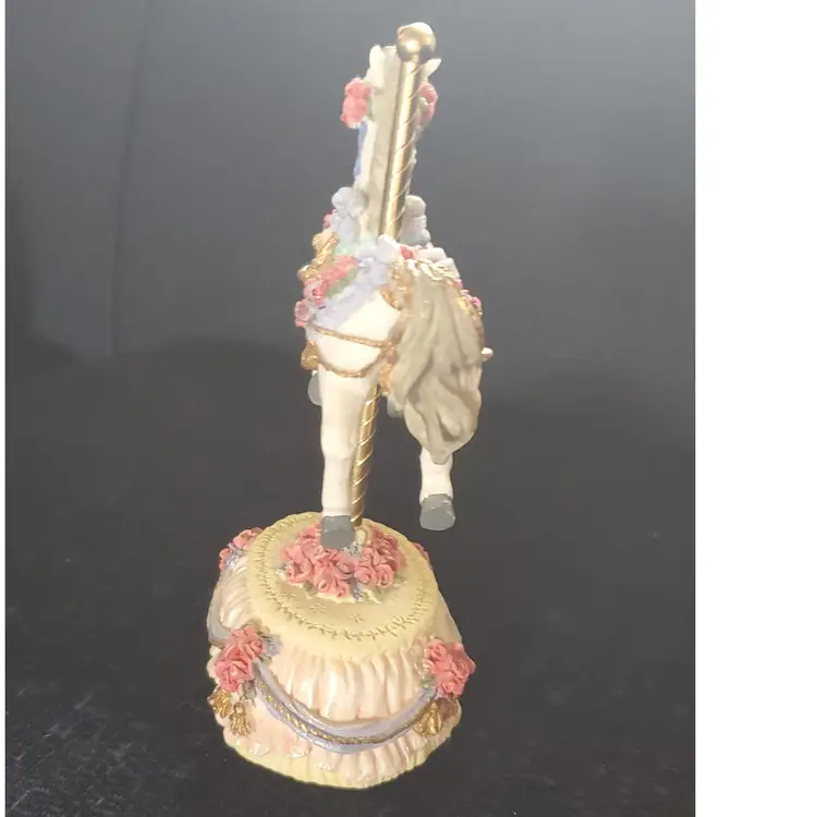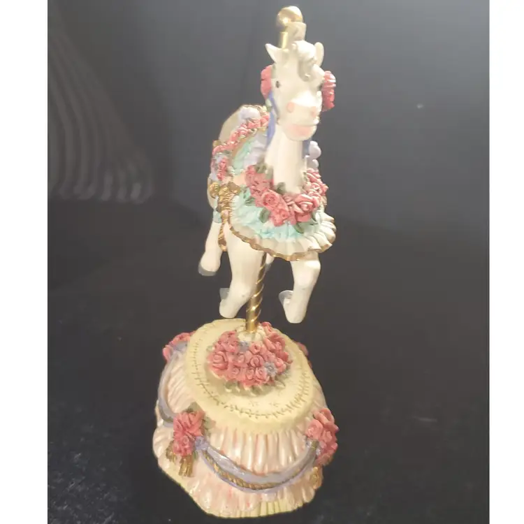 Vintage carousel horse from the Melodies County Fair Collection. Plays the tune "Yesterday". Press the ribbon on the bottom to play music. So cute for a child's room. Measures 6 1/4" high by 4" wide.