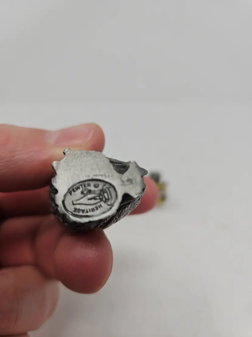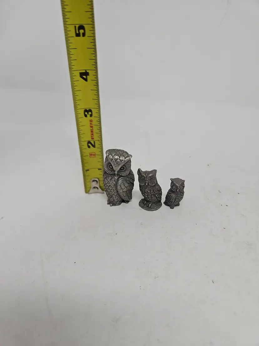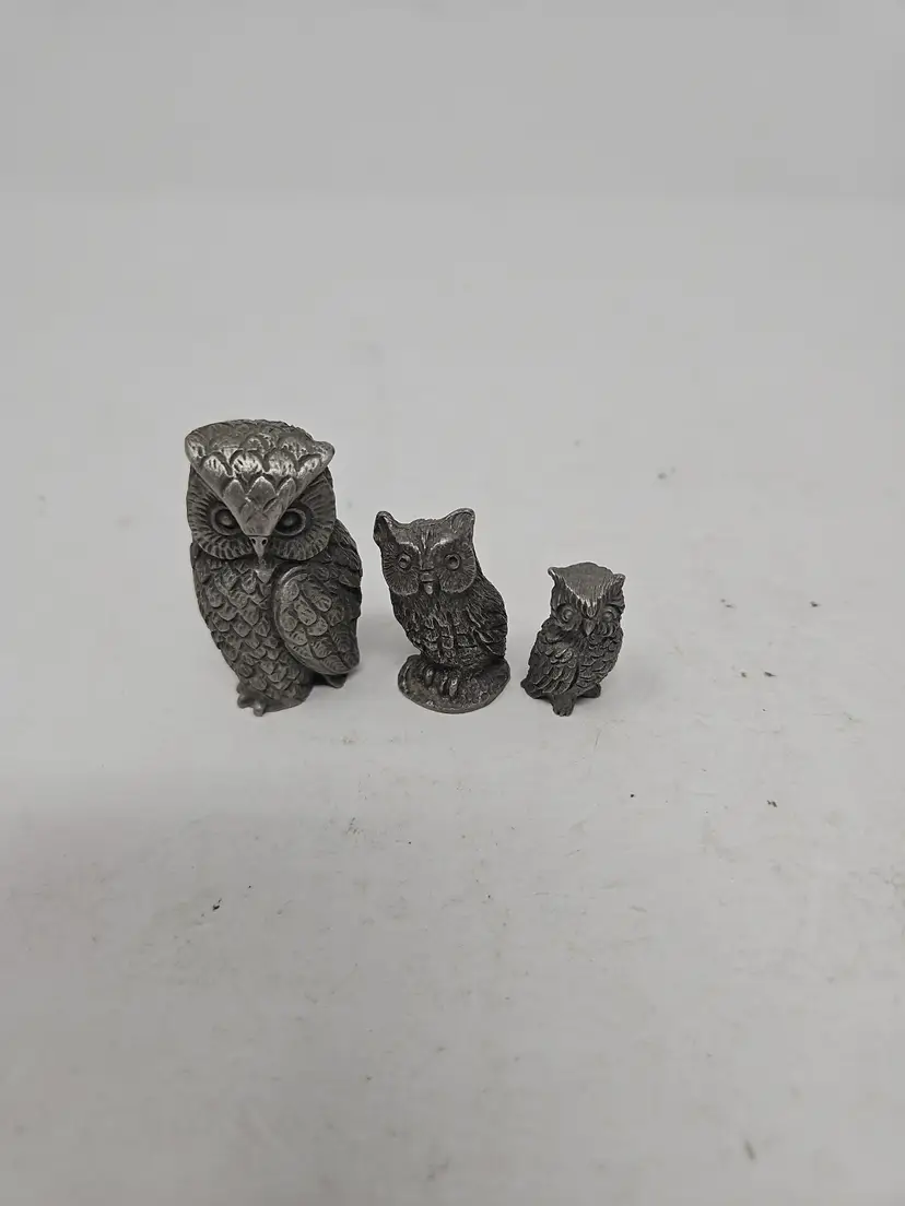 The Heritage Pewter Owls Set of 3 is a vintage collection of figurines made of pewter. The set includes three intricately crafted owls, perfect for collectors of metalware and vintage decor. Each figurine is a unique piece that adds character and charm to any space, making it a desirable addition to any collection.