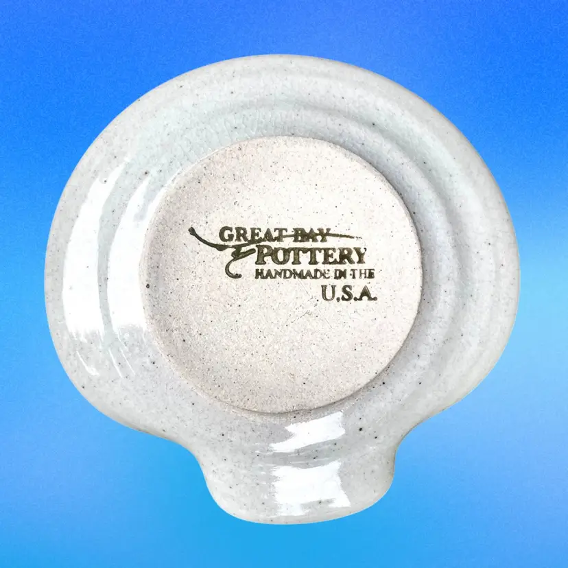 This stoneware spoon rest is made by Great Bay Pottery in New Hampshire. It measures approximately 6” high and wide and is in excellent condition with no cracks or chips.