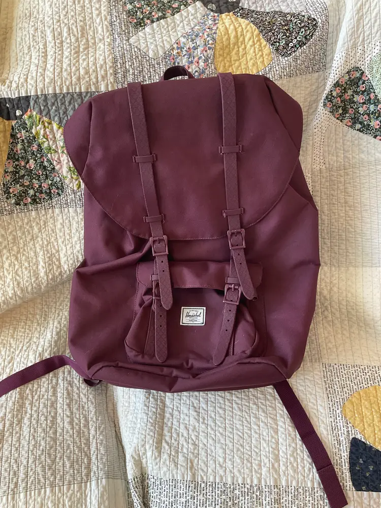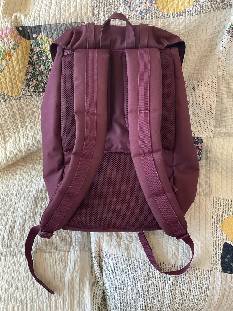 A simple but classic pack in a sort of cranberry/maroon color. Cute and comfortable! It's been on a few trips, but it's in good shape and has a lot of life left. Let me know if you have any Qs!