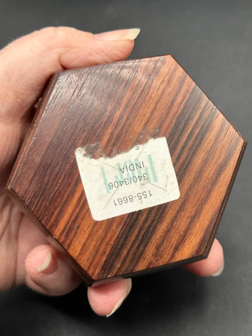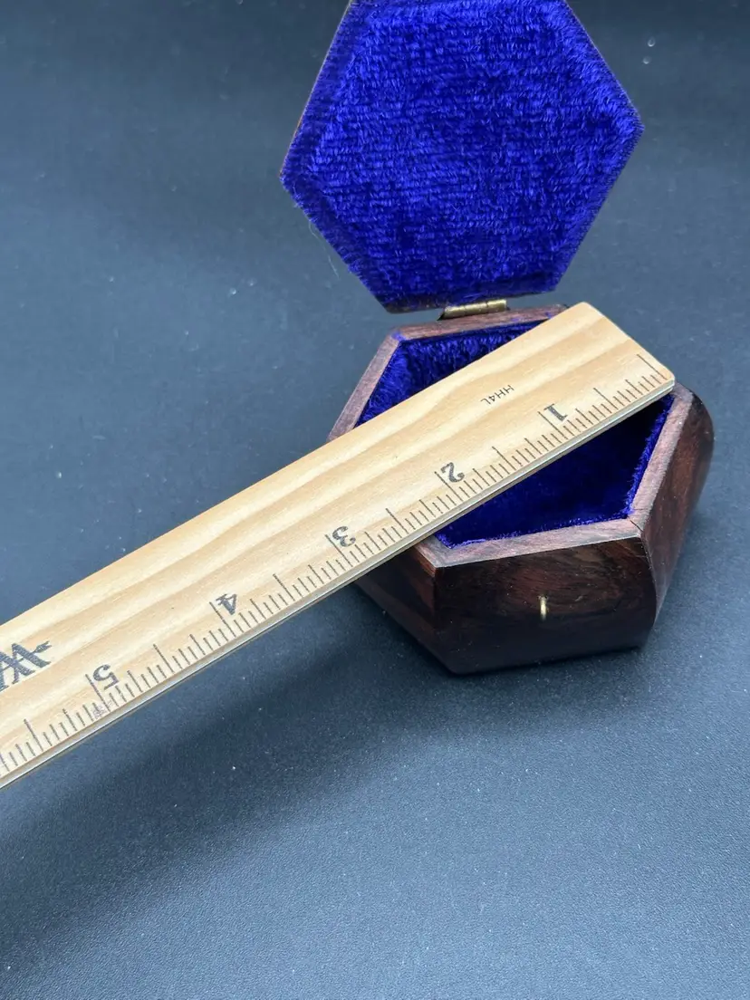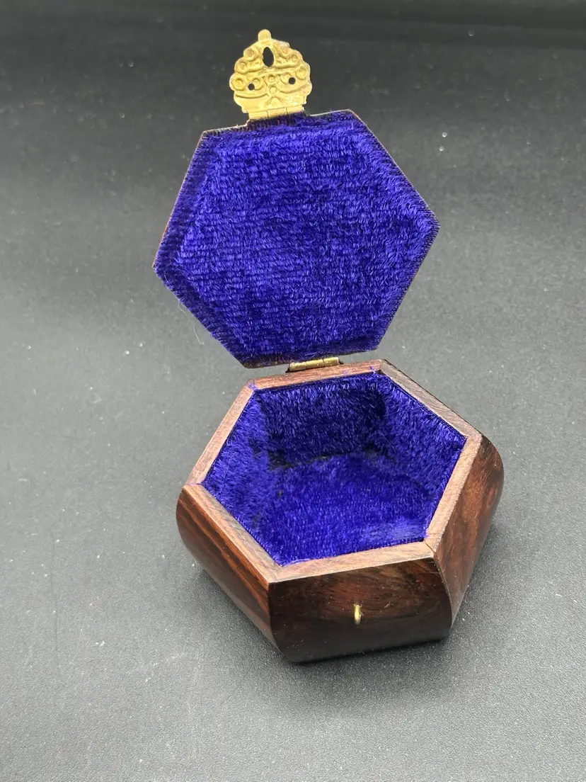 Hexagon Wooden Box With Brass Accents. Sapphire Blue Lining. Vintage 4 X 3