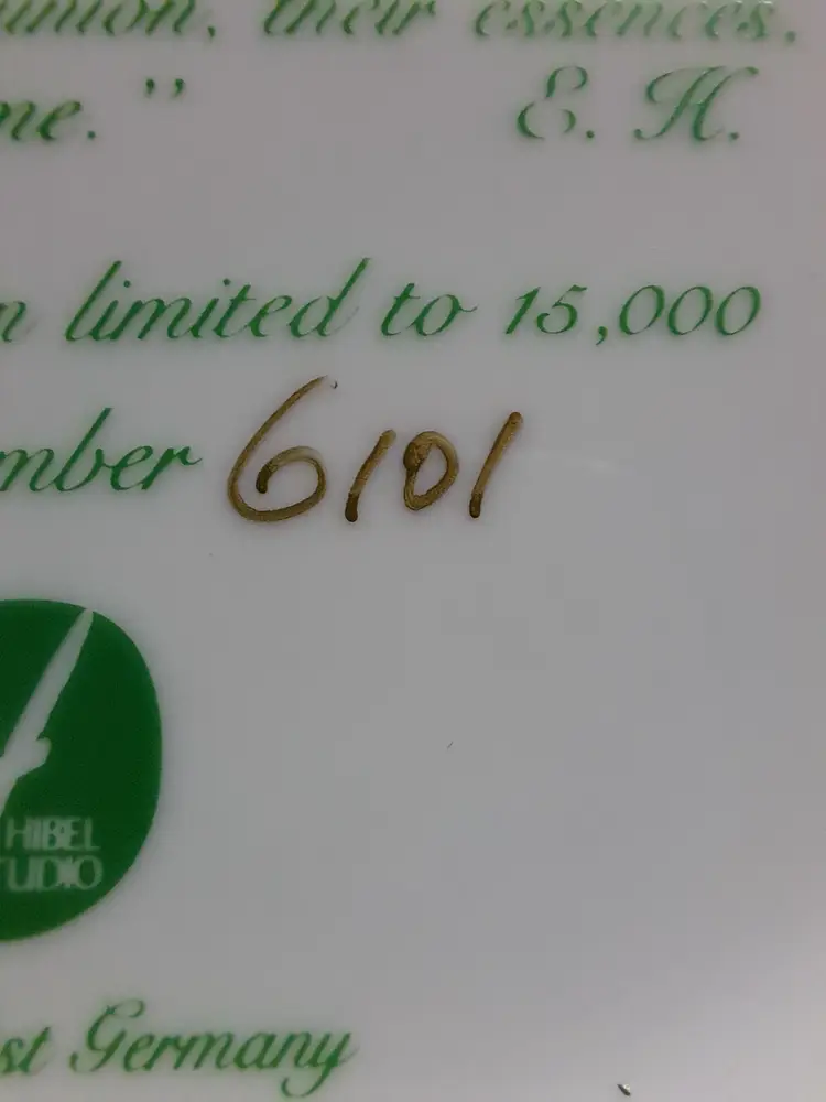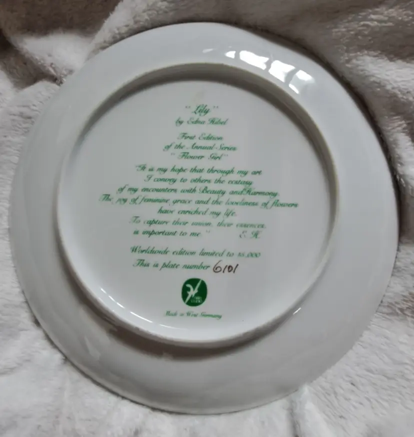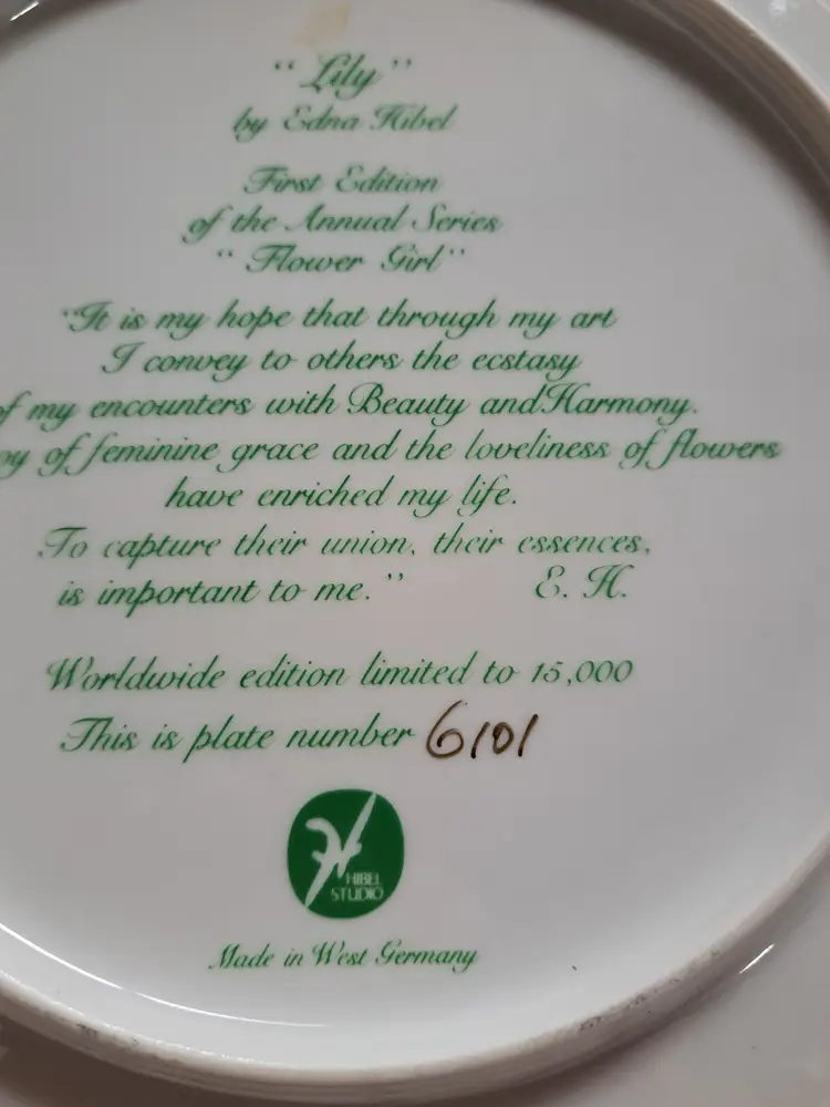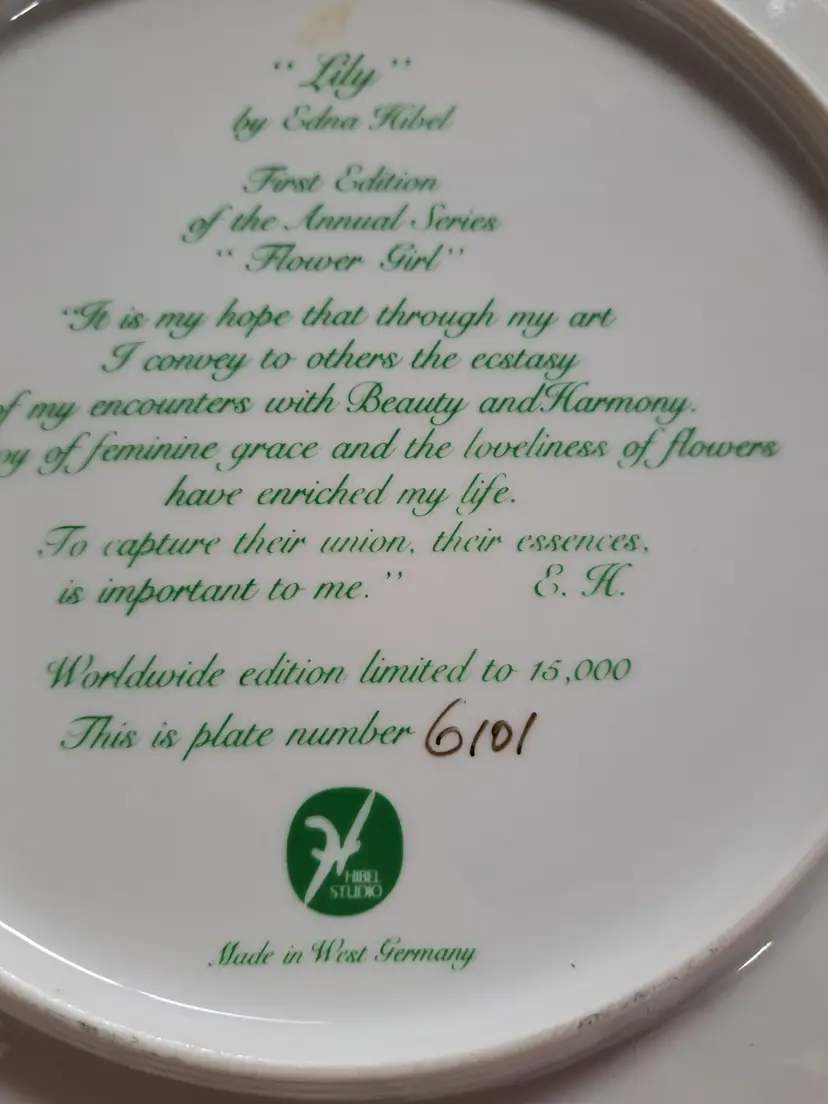 Up for sale we have this Hibel Studio "Lily" by Edna Hibel, first edition of the annual series "Flower Girl", made in West Germany. This collector's plate is number 6101 of 15,000. First off, this is an estate sale find and in very nice condition with no chips, cracks or repairs. This plate is gorgeous! This plate is hand painted and measures about 10 inches in diameter. Indeed a lovely addition to your collector plates. Thank you for looking.