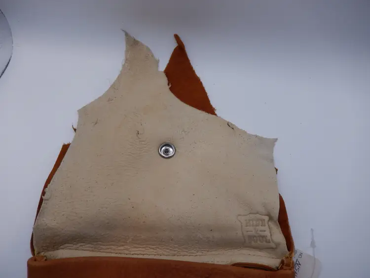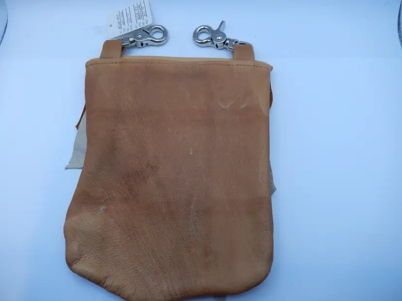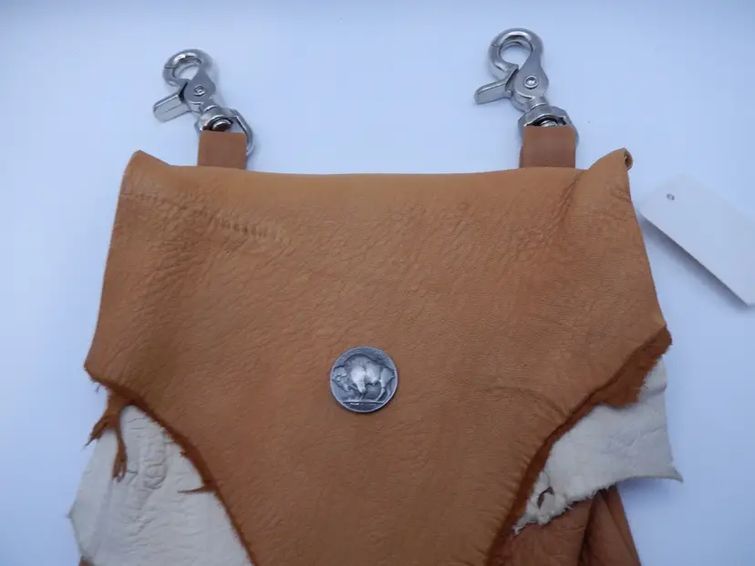 New with tags(Retail tag is $55.95) Current MFG price is 60.00 Measures: Approximatly 6" W x 7" H (Hardware attatchment adds approx. 3") Condition: New with tags Color: Camel & Natural color Charecteristics: This leather is NOT proccessed (ground up and glued back togeather). It has natural flaws. These ARE left with the natural raw edges making these purses / bags truley ONE OF A KIND! Please look closely at the pictures before ordering. Some discolorations. Leather conditioner to clean may take out some discoloration.