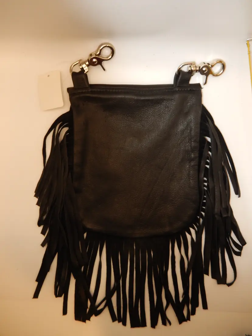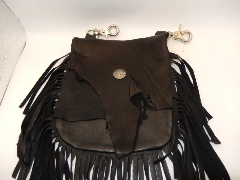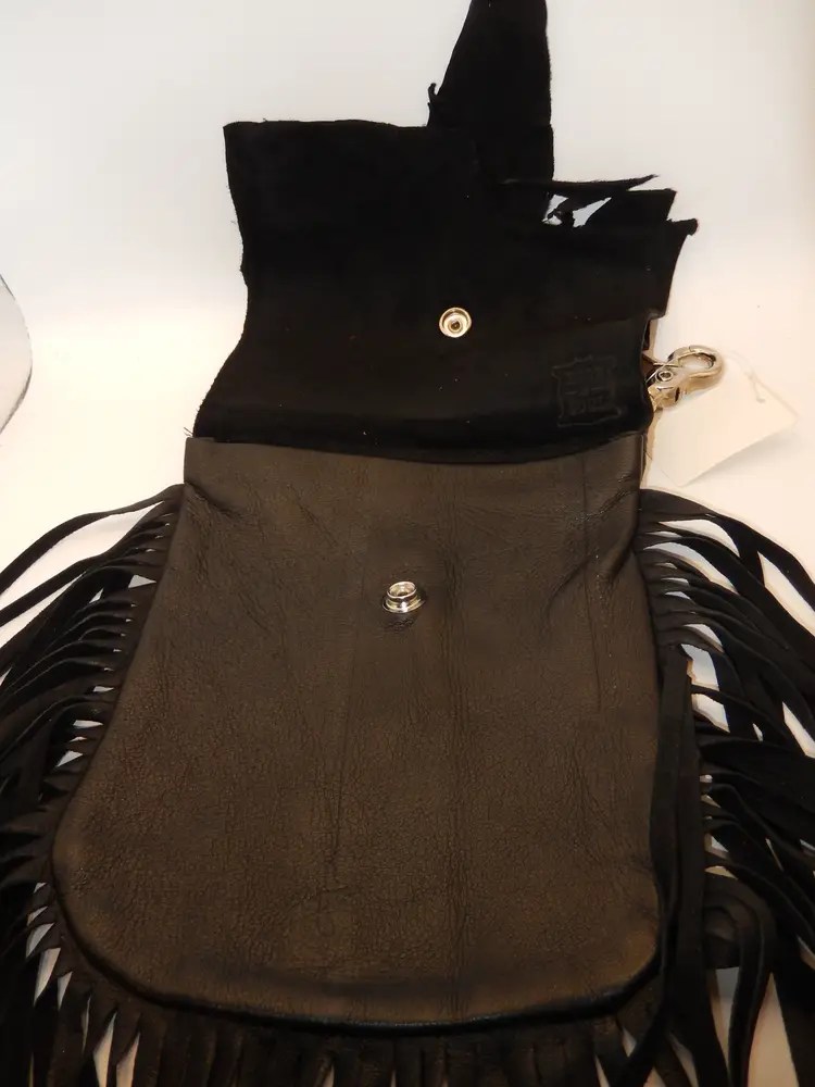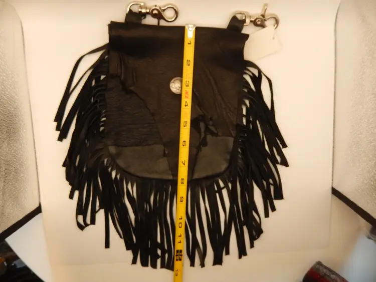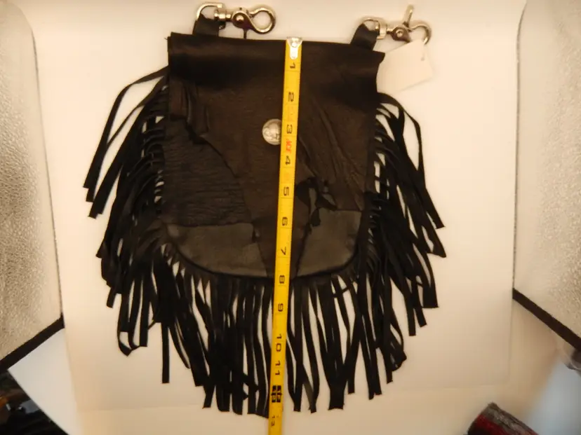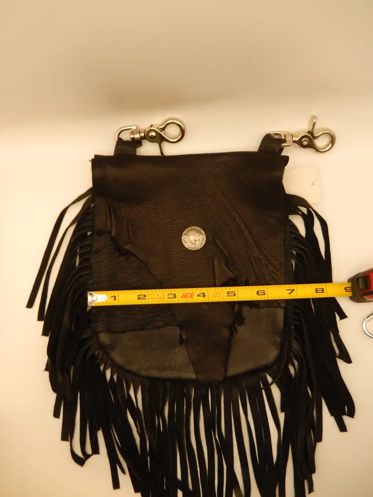 New with tags(Retail tag is $59.95 which is pricing from a few years ago, curent MFG price is $75.00) Measures: Approximatly 6" W x 7" H (Hardware attatchment adds approx. 3") Condition: New with tags Color: Black Fringe: Black Charecteristics: This leather is NOT proccessed (ground up and glued back togeather). It has natural flaws. These ARE mostly left with the natural raw edges making these purses / bags truley ONE OF A KIND! Natural leather color variations may be present. Please look closely at the pictures before ordering.