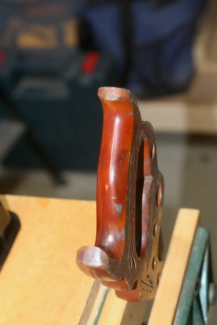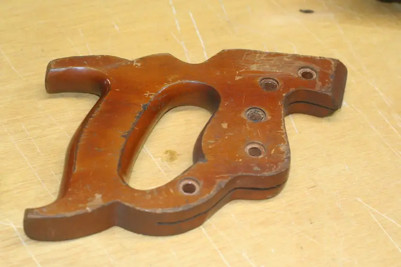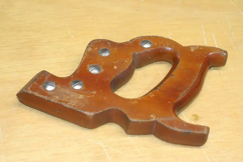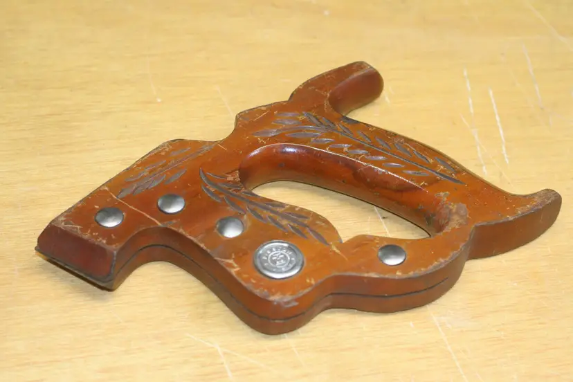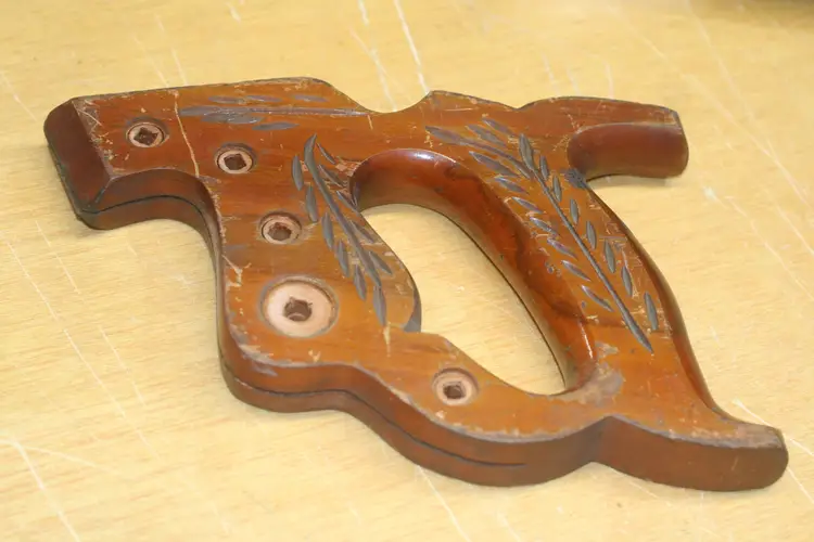 On offer here is a decorated vintage hand saw handle/tote including original hardware screws/nuts and Disston medallion.