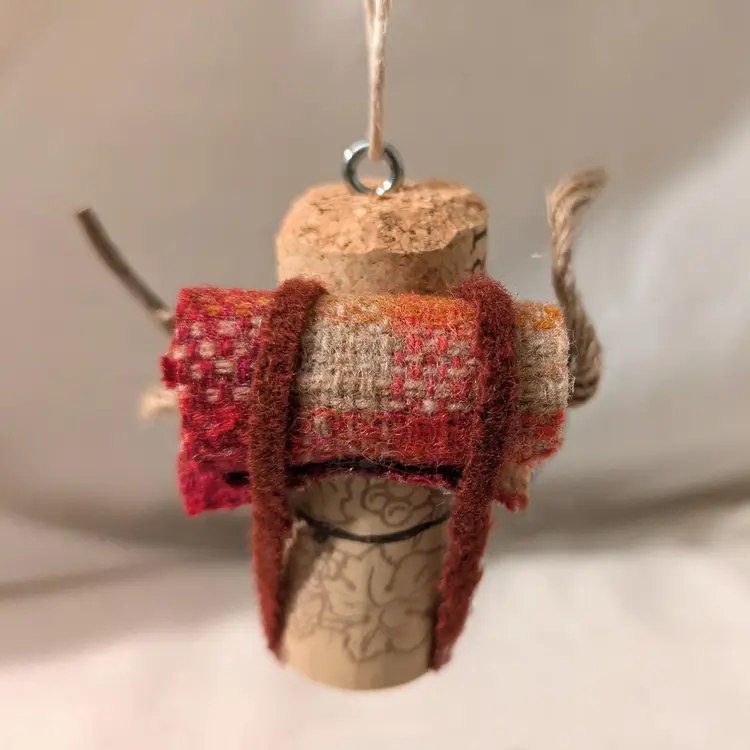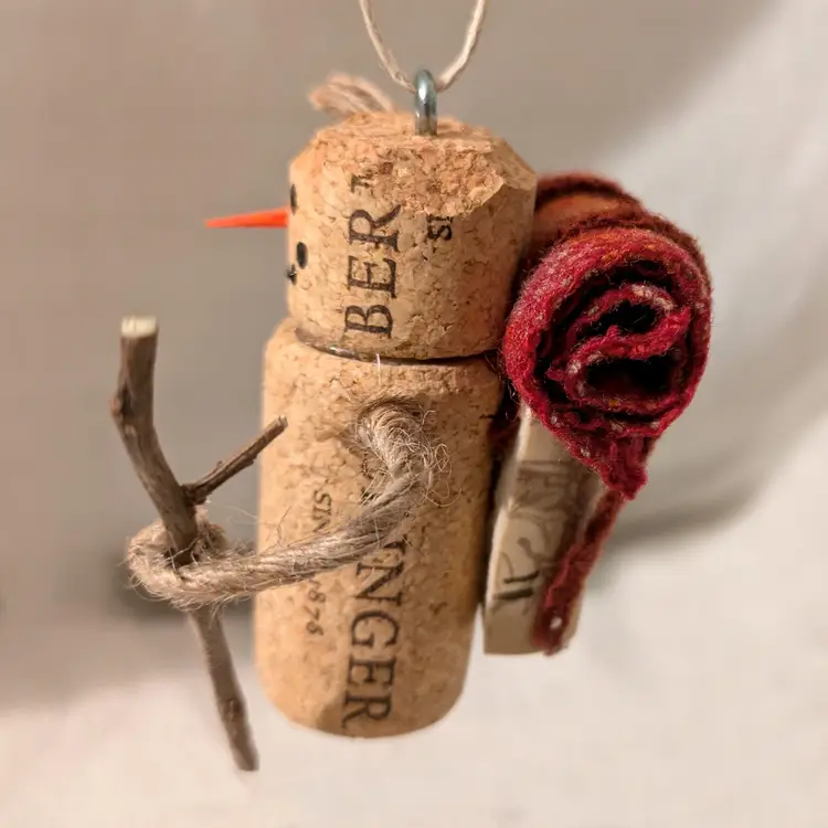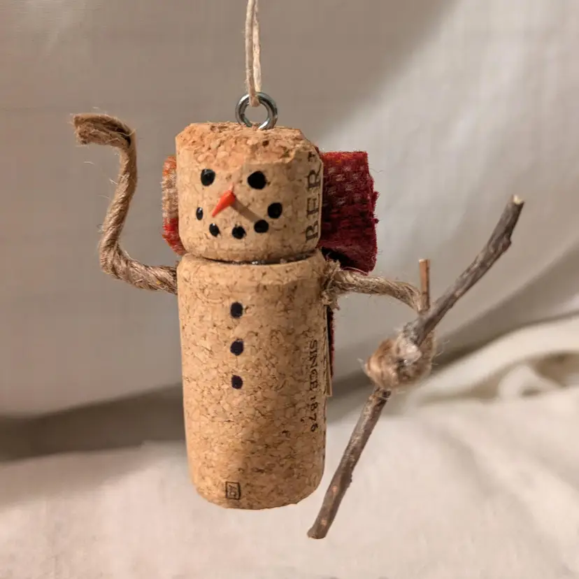 Add a touch of whimsy to your holiday decor with this charming cork snowman ornament. Featuring a backpack and cozy sleeping bag, this little buddy is ready to go out on an adventure. Perfect for your tree or as a unique gift.