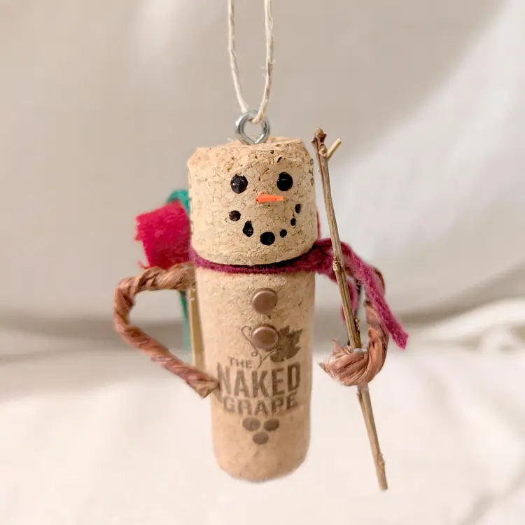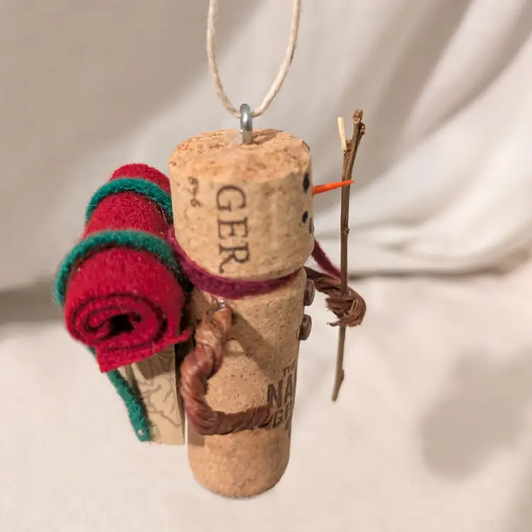 Add a touch of whimsy to your holiday decor with this charming cork hiker snowman ornament. Complete with a backpack and sleeping bag, they are ready for outdoor adventure. It's perfect for bringing festive cheer to your space or gifting to a friend.