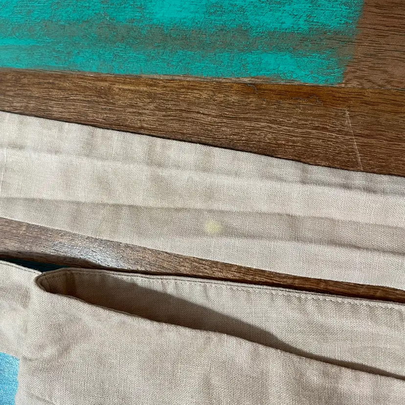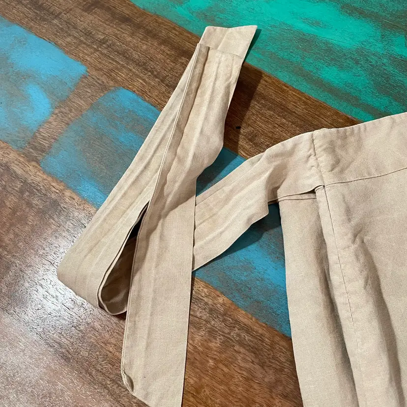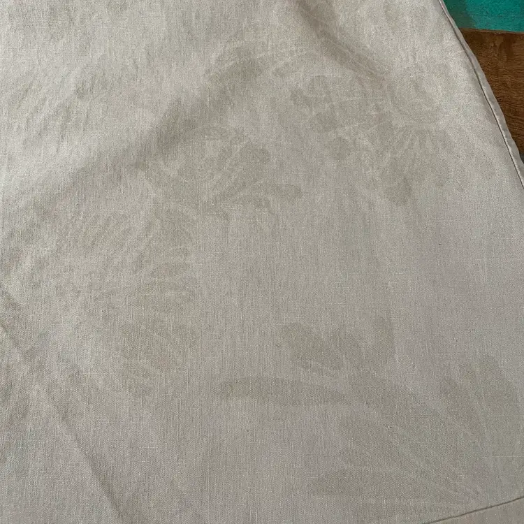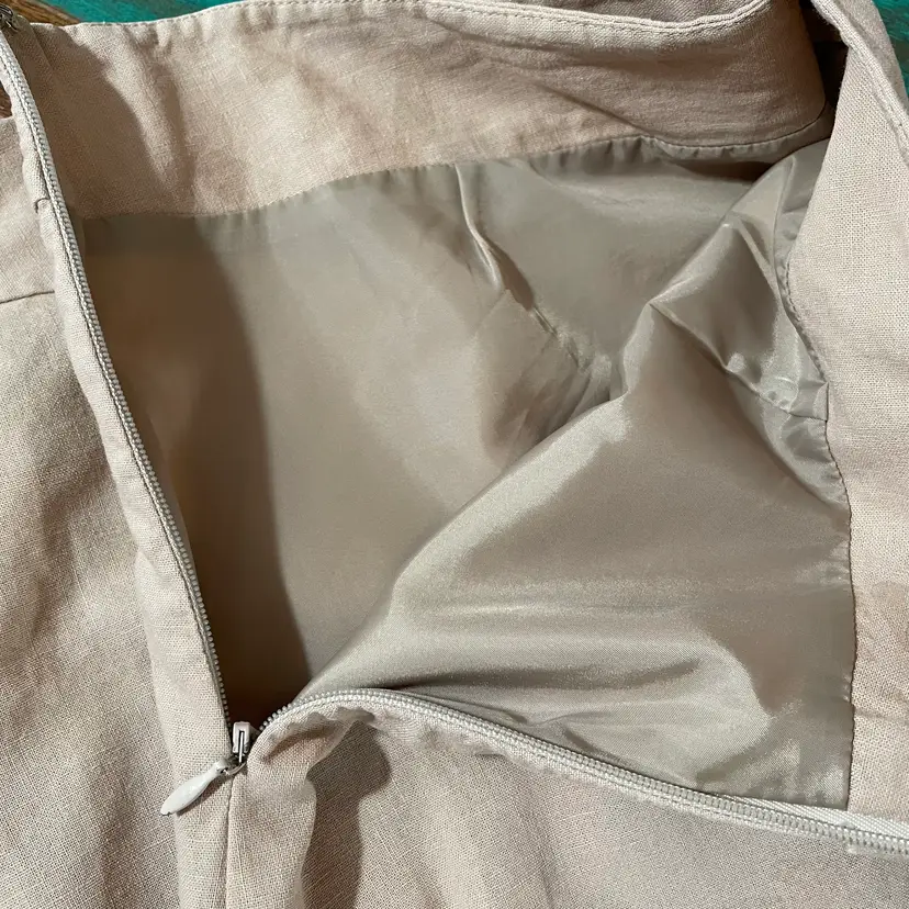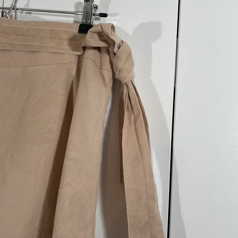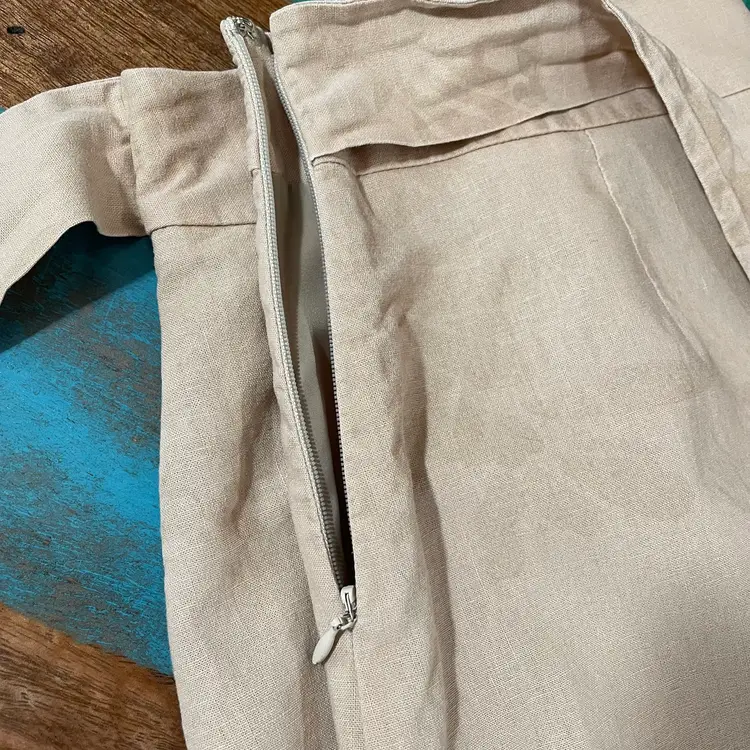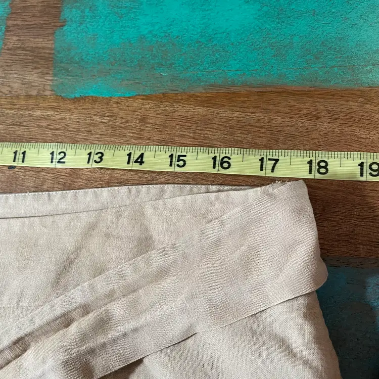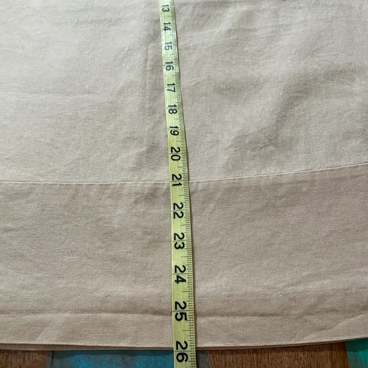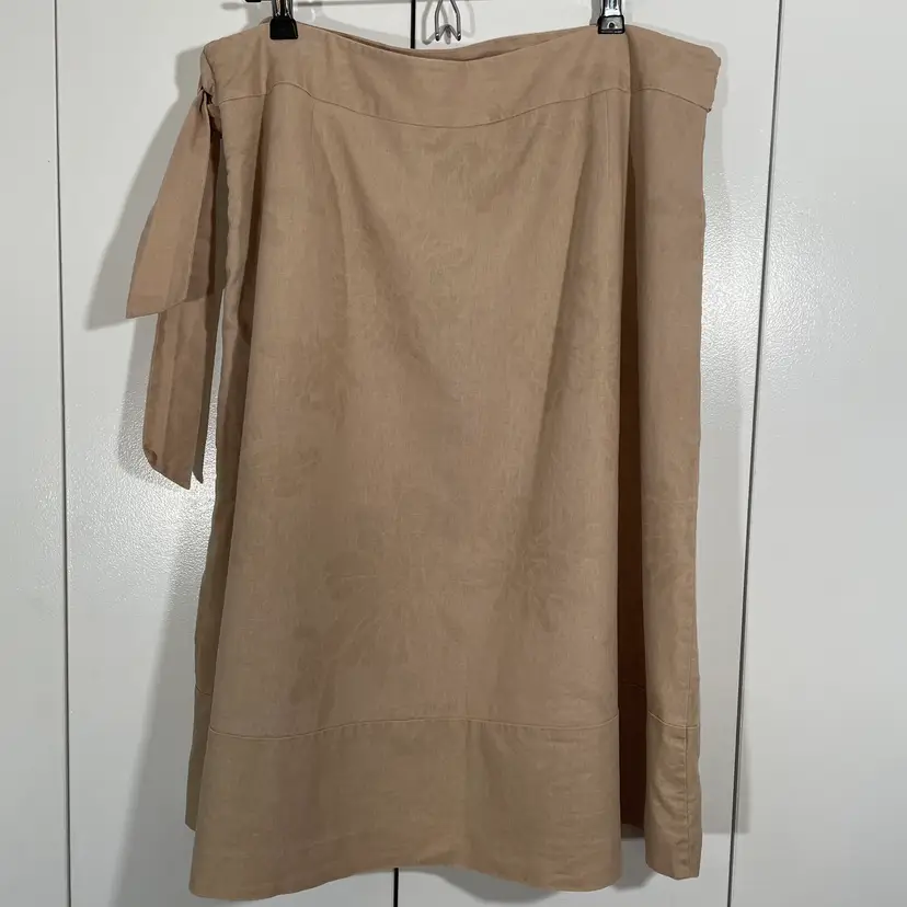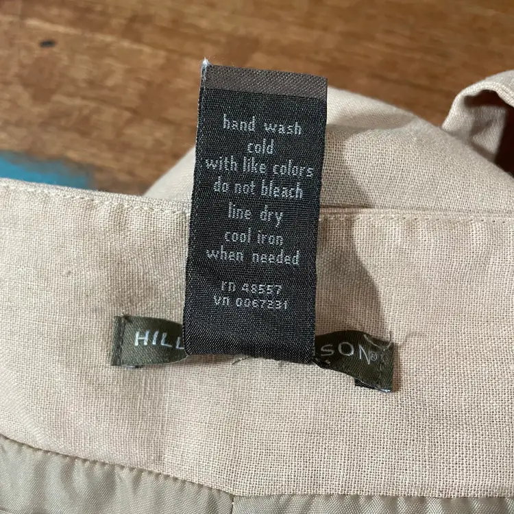Hillard & Hanson Linen Blend Skirt Midi Condition: Used but in very good condition. No holes or rips. There is the most subtle discoloration on the bottom hem, not very noticeable unless your looking for it. Also, a white spot on a section of the belt. I've tried to capture these in the last photos. Size: 12 Color: Tan Long A-line with a wide bottom hem Built-in belt Fully lined Subtle floral pattern in a slightly darker color. A slightly metallic gold thread seems to be used for the pattern and you can see the slightest sheen in the light. 51% Linen, 49% Cotton Measurements taken with item lying flat Waist: (Across the waist) 18" Length: (From top of waist to bottom of hem) 26"