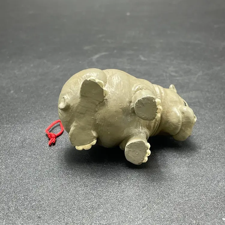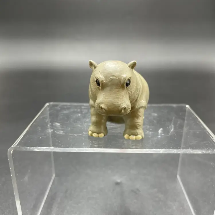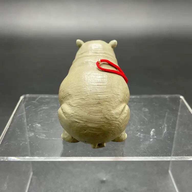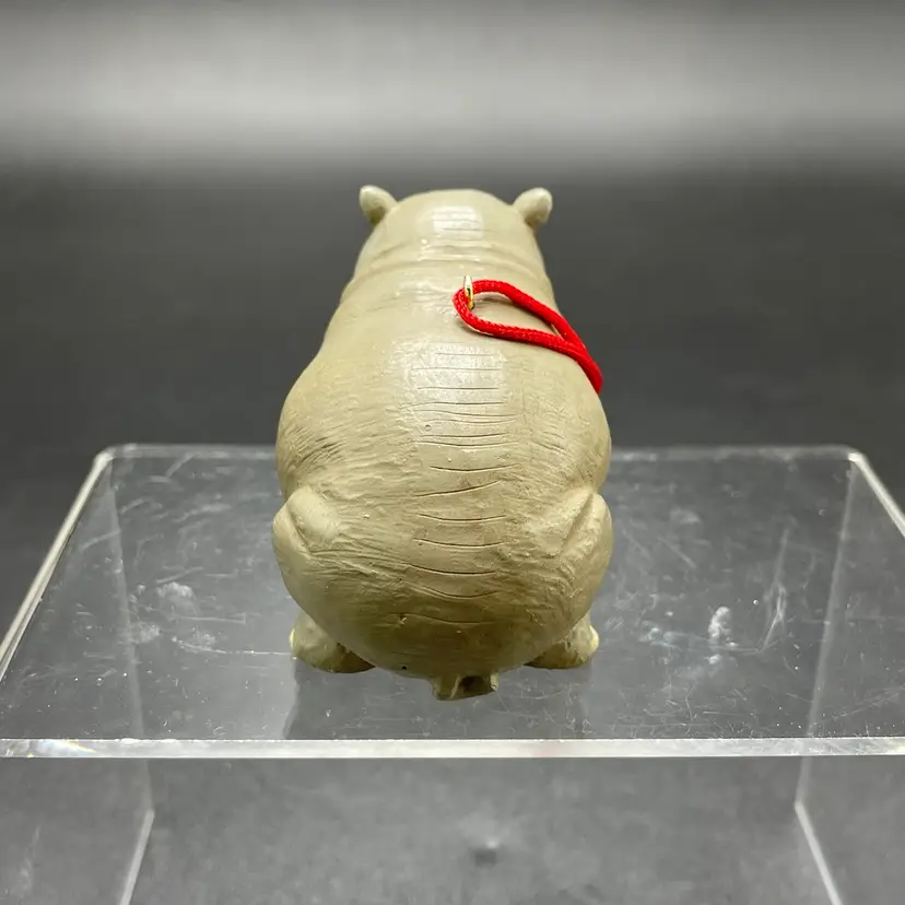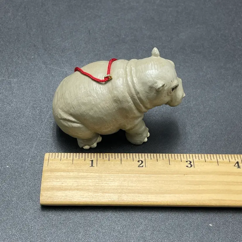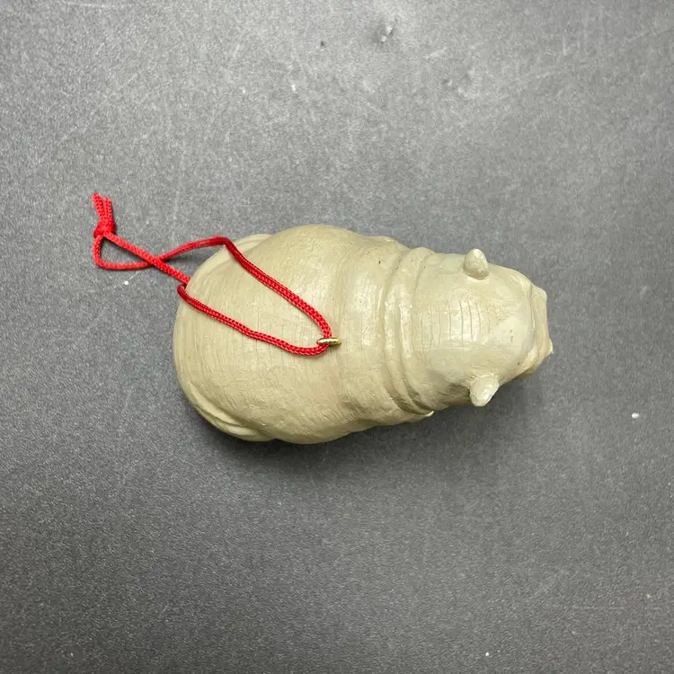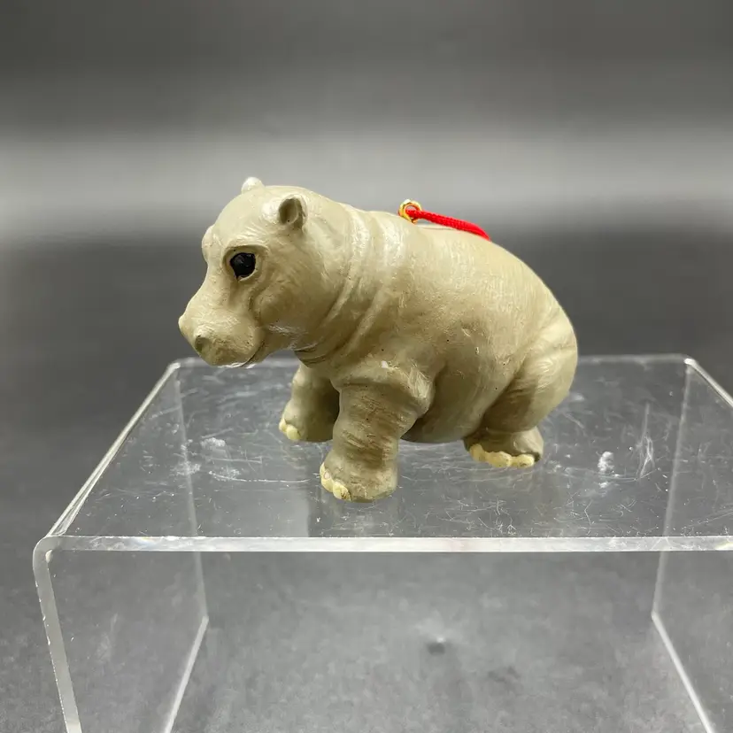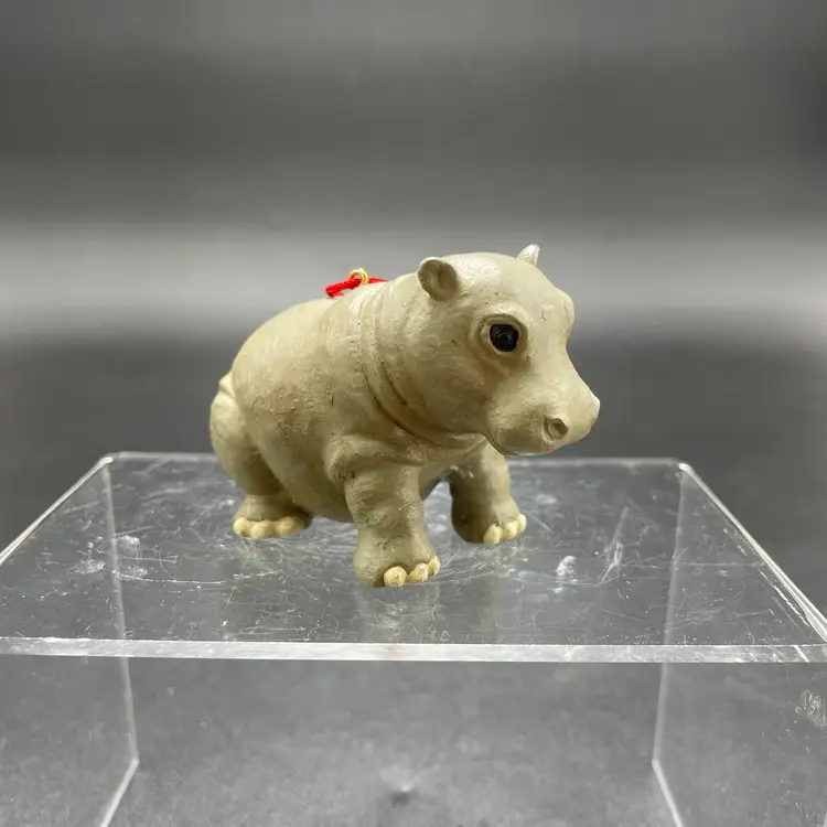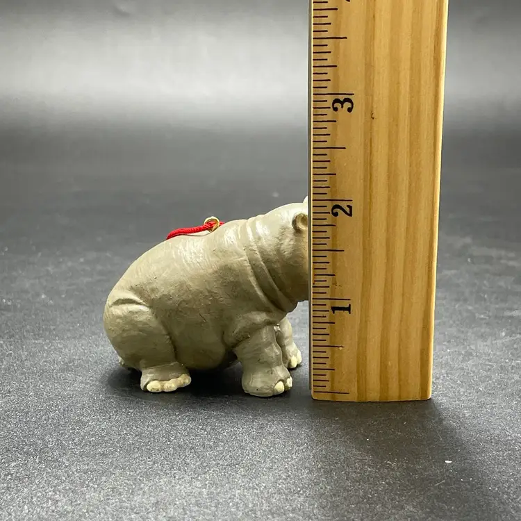 This is a vintage resin Hippo hanging ornament. Measures approximately 2" tall x 3" long. There is a tiny paint chip on one leg as shown in pictures. No other major flaws.