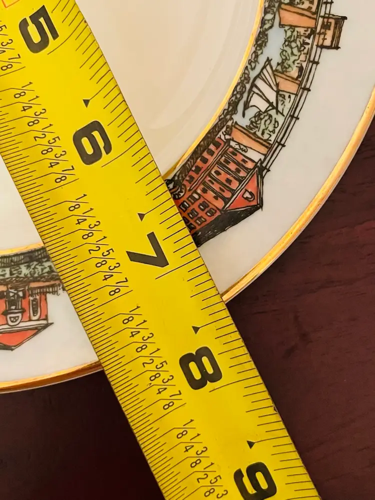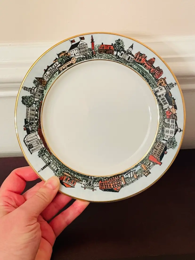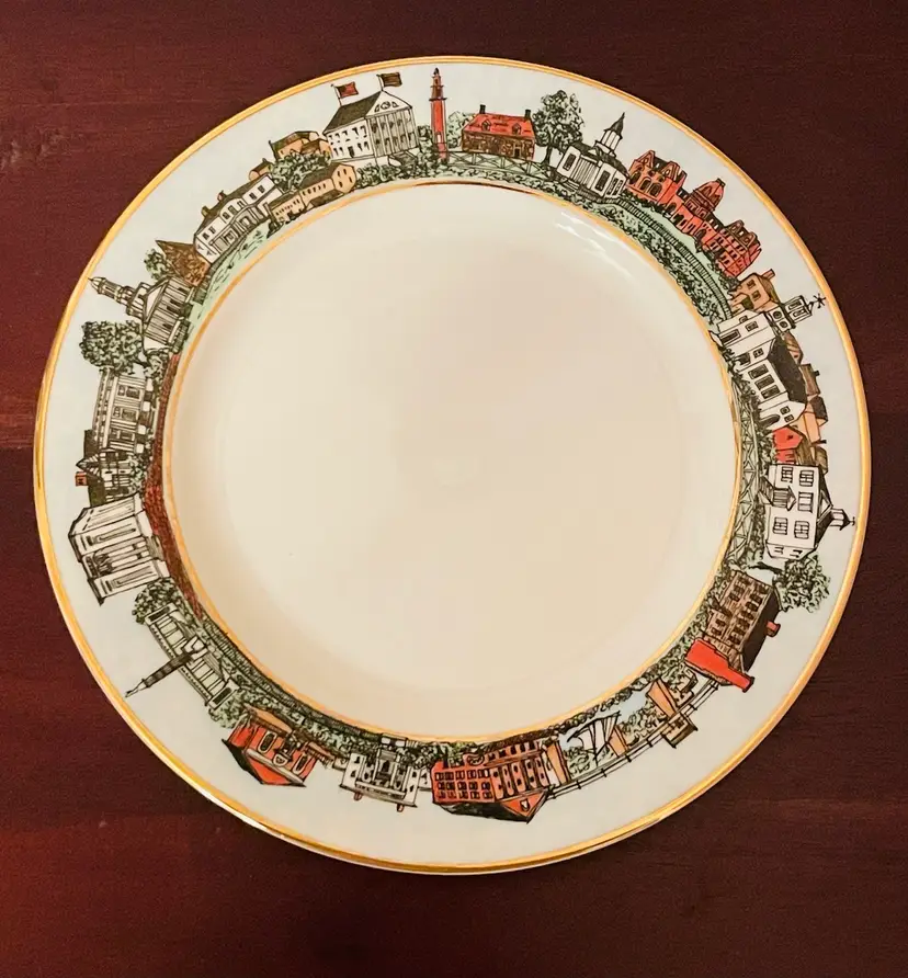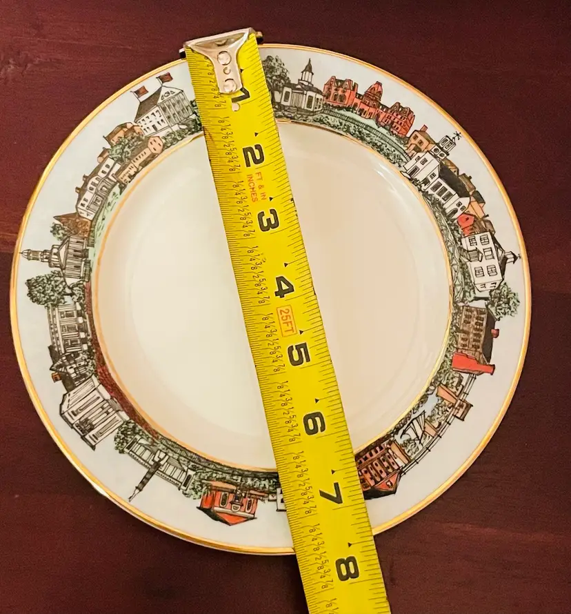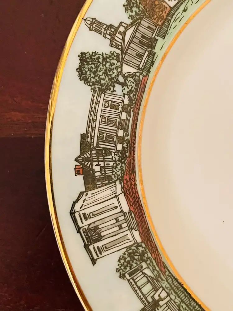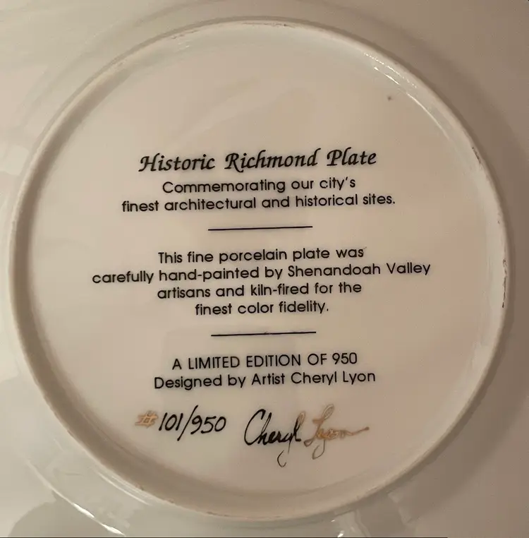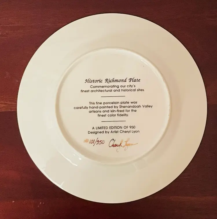 Details: • Diameter: 8 inches • Fine porcelain • Limited edition, artist signed • Hand-painted Richmond, Virginia cityscape • Gold rim accent