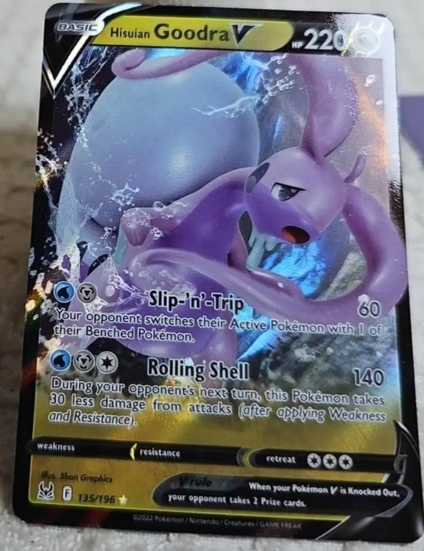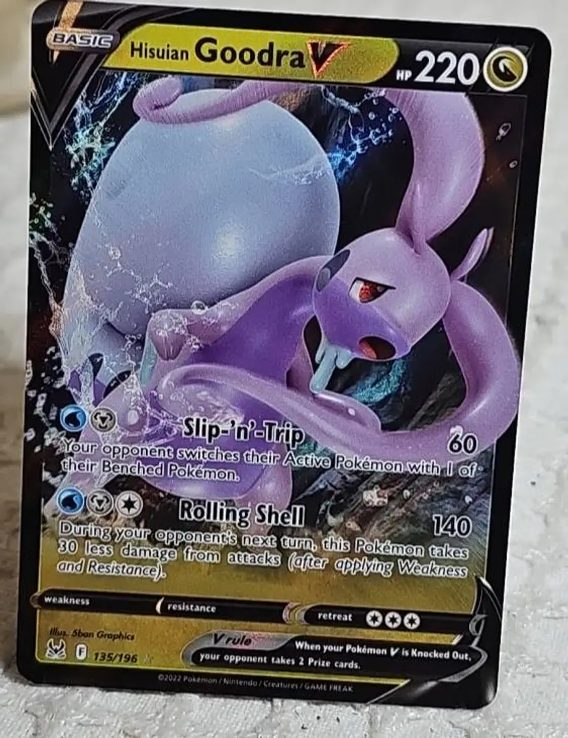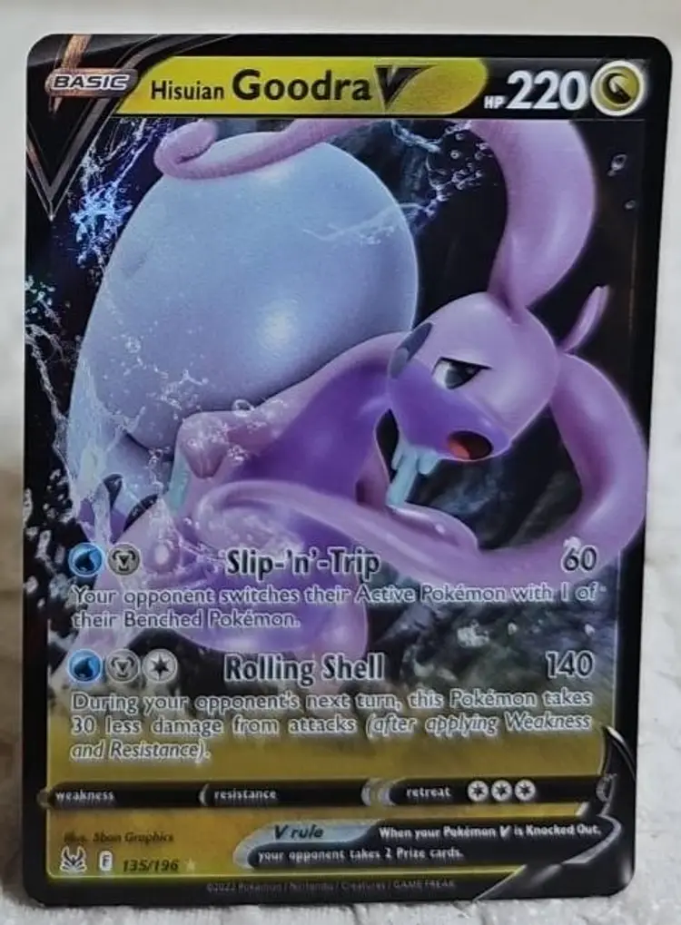 The Hisuian Goodra V card is part of the Pokémon TCG Sword & Shield Lost Origin set released in 2022. This Ultra Rare Full Art card features the character Goodra with 220 HP, illustrated by 5ban Graphics. The card is in English, manufactured in the United States, and belongs to the Dragon attribute. With its holo finish and speciality as a V card, this collectible card is a sought-after addition to any Pokémon TCG collection. NM