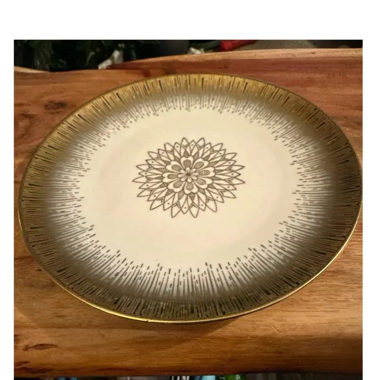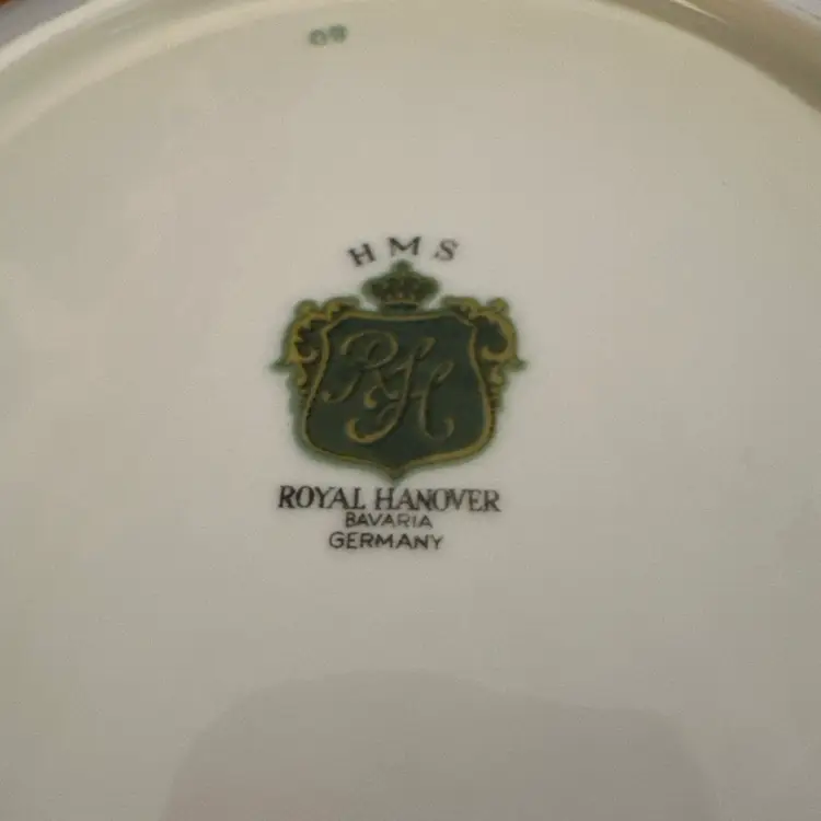 The HMS Royal Hanover Bavaria Gold Floral Porcelain Plate is a stunning 8" round plate decorated with a beautiful gold floral design, perfect for all occasions. Hand painted in Germany by a renowned Bavaria brand, this Victorian-style plate is a collectible piece that adds a touch of elegance to any table setting. Made of porcelain and featuring intricate hand-painted details, this original piece is sure to impress guests and elevate your dining experience. Remember to hand wash only to maintain its exquisite condition. Excellent condition, no sign of use.