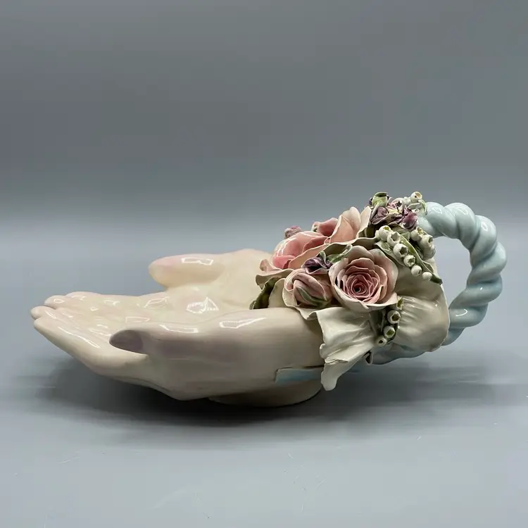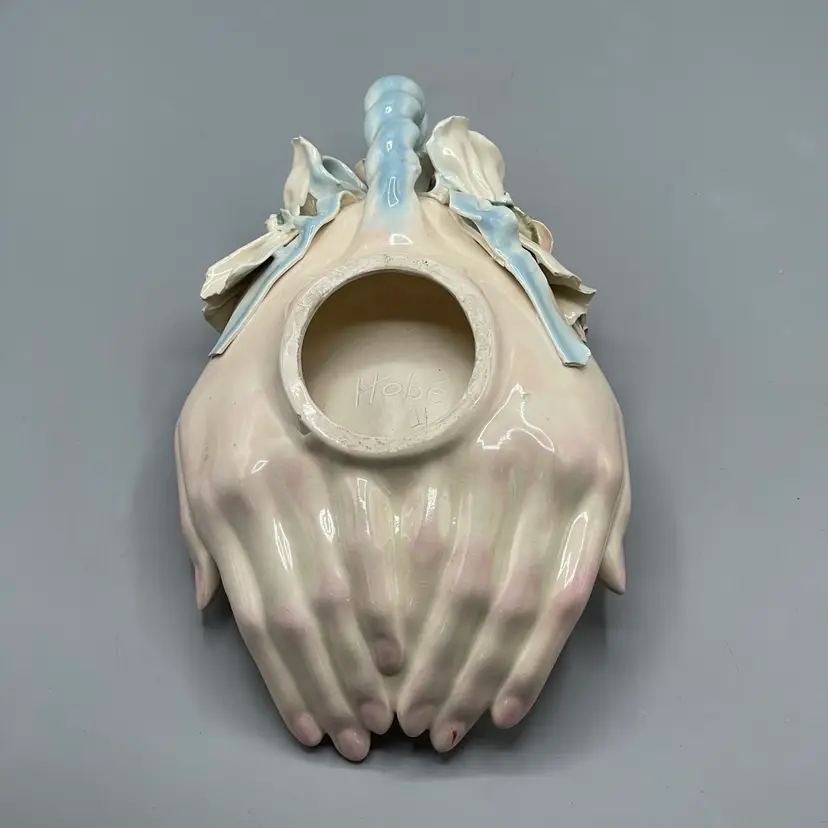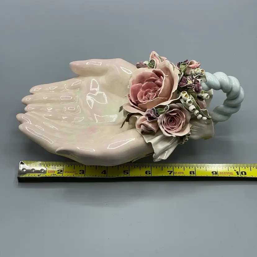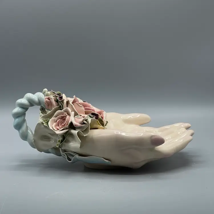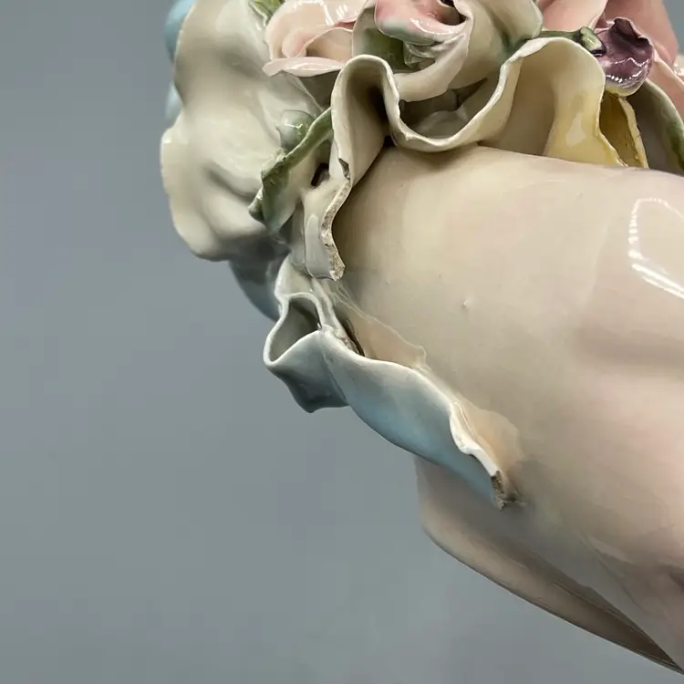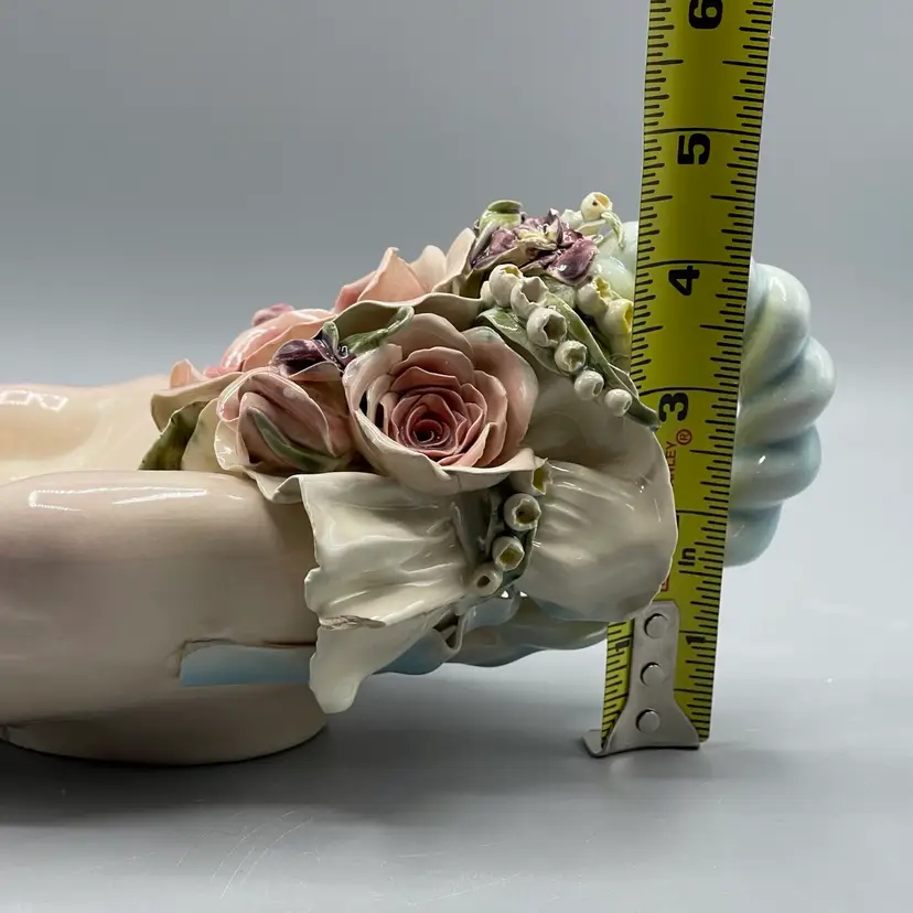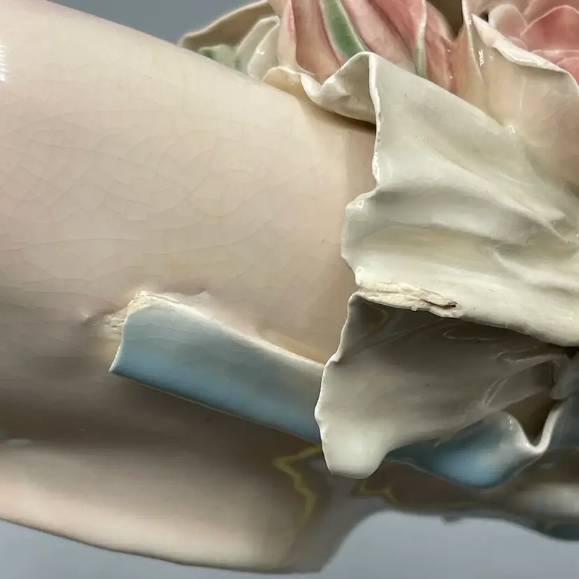 Heavy crazing on the hands and chipping on floral & ribbon details. About 10 inches long and 4-1/2 inches tall.