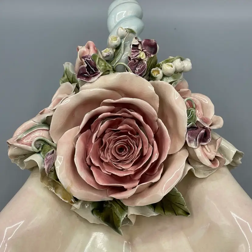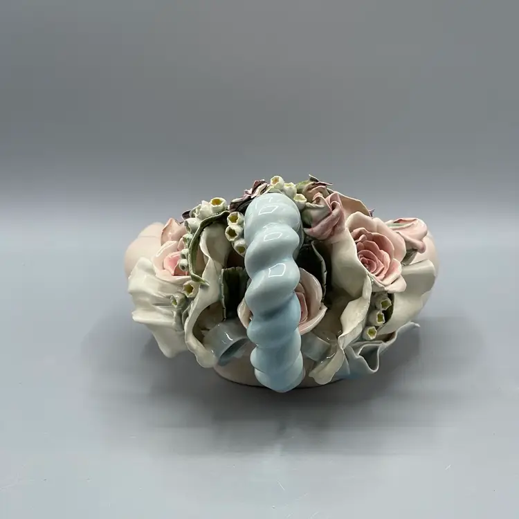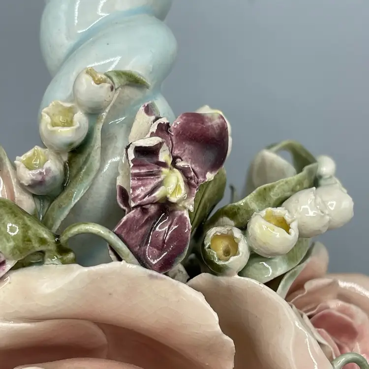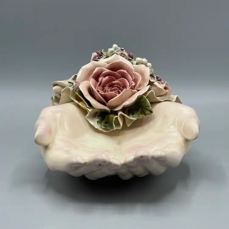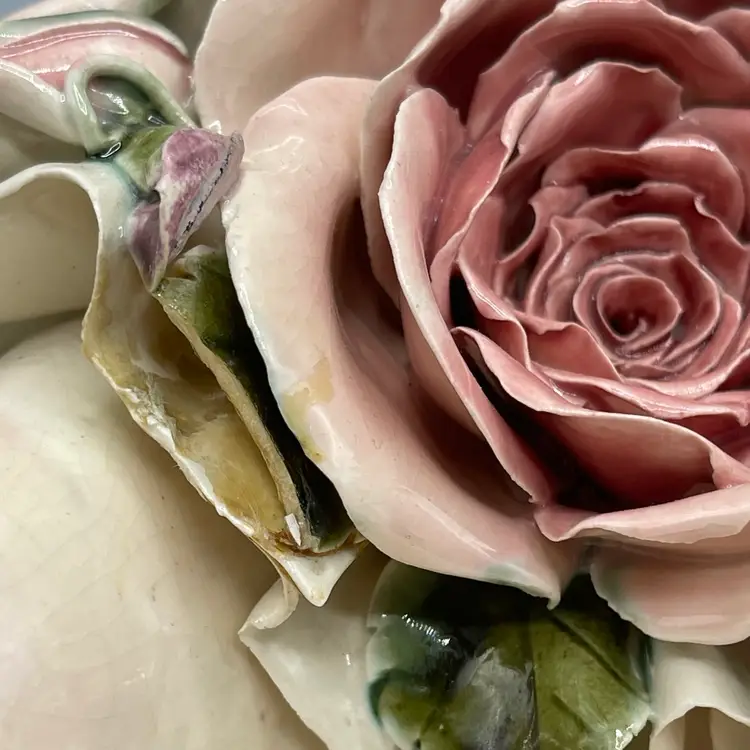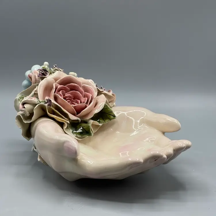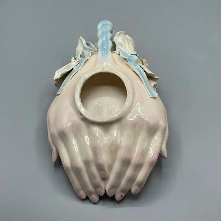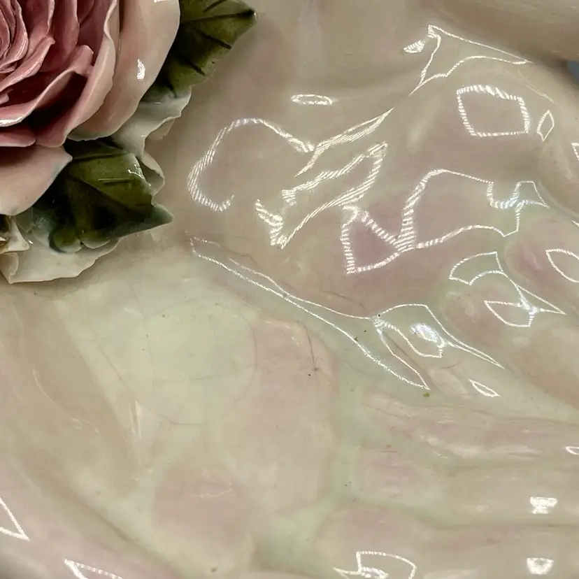 Heavy crazing on the hands and chipping on floral & ribbon details. About 10 inches long and 4-1/2 inches tall.