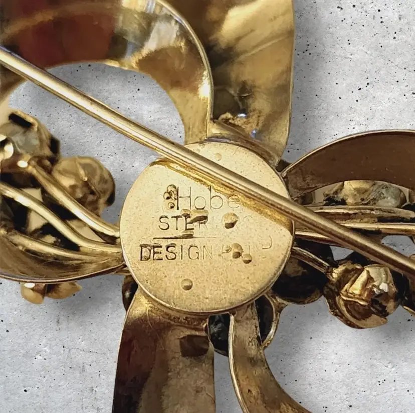 Large floral design Acid tested sterling silver Marked on the back "HOBE STERLING DESIGN". Straight pinback with rollover clasp. Excellent condition! Measures approximately 3-1/4" H x 2" W.