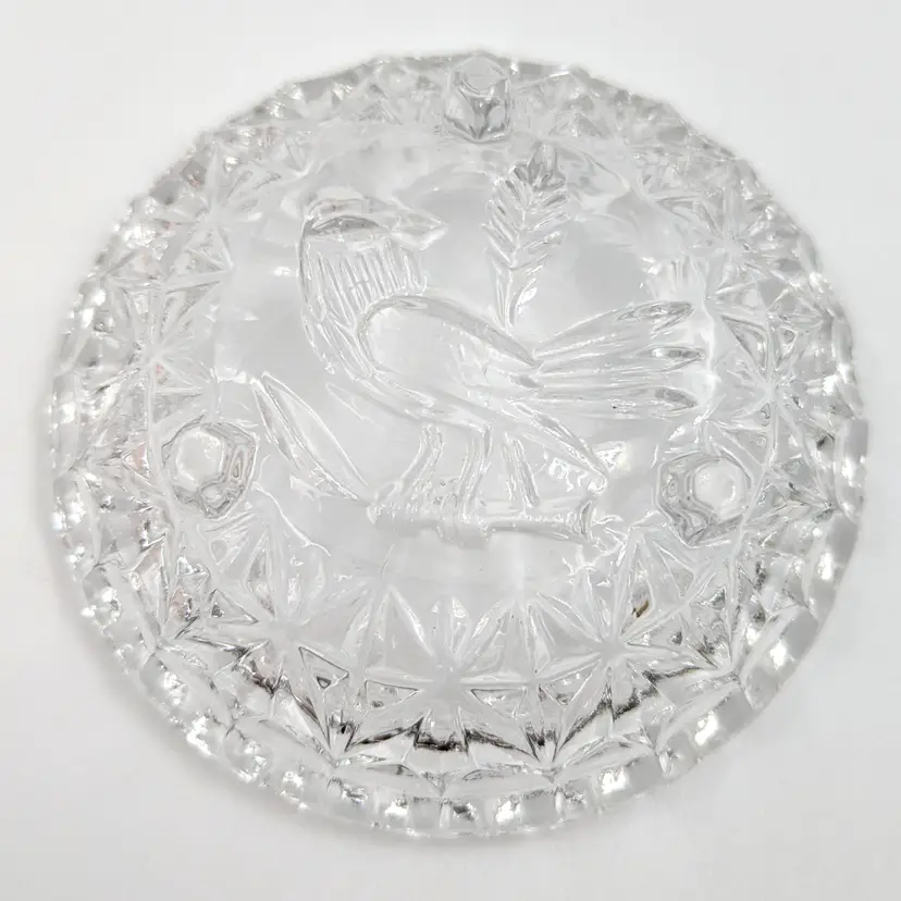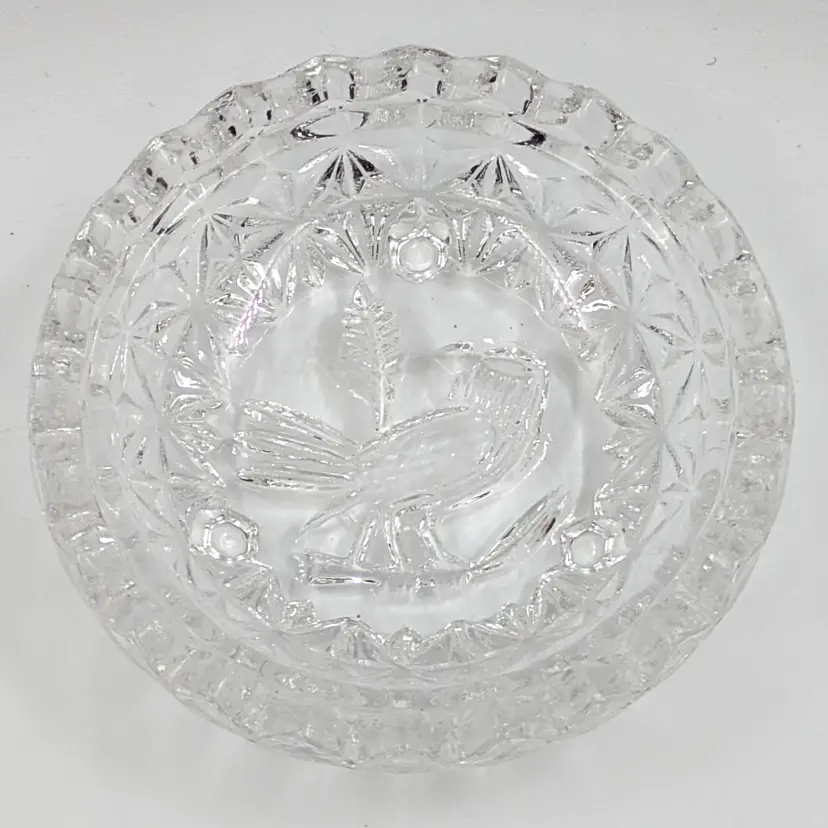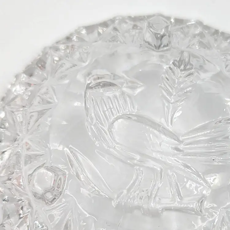 A vintage Hofbauer "Byrdes" round leaded crystal dish with a bird in the base of the bowl. The dish has three little and has a sawtooth rim. Made in West Germany. No chip or cracks.