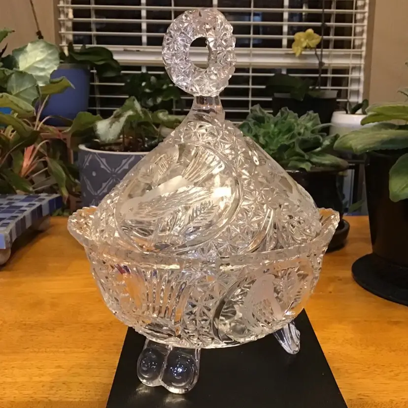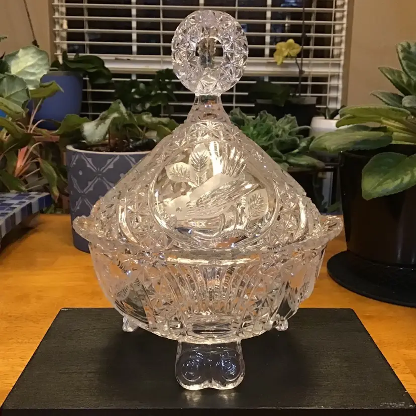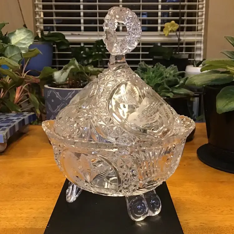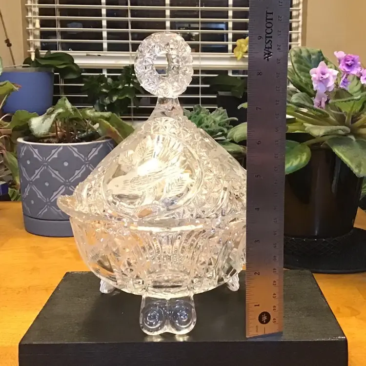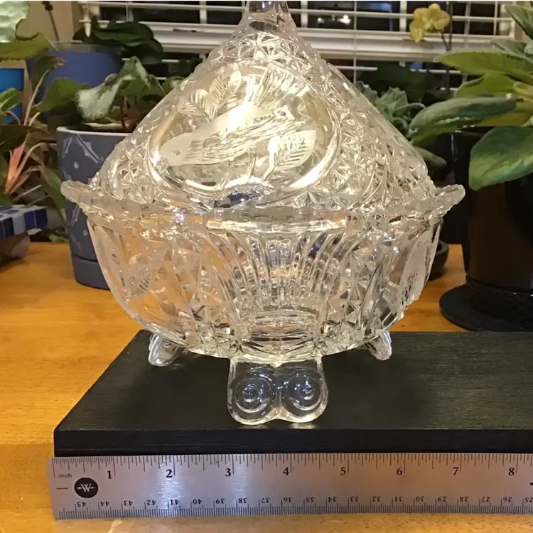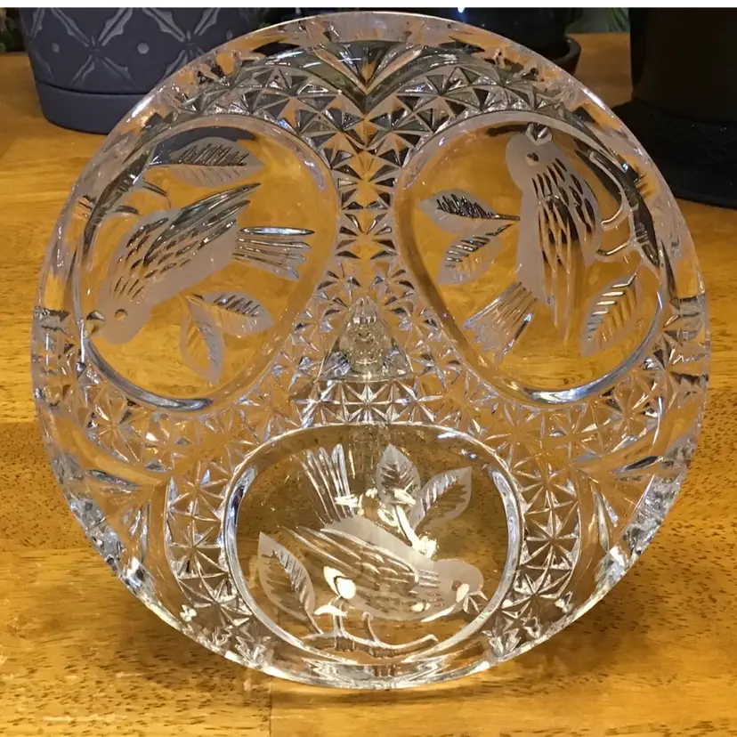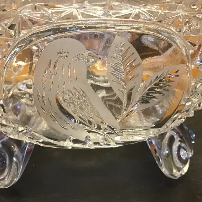 Absolutely beautiful candy dish is in excellent condition with no chips, cracks, or repairs. Bird design is both beautiful and cute. Size is in the pictures. See all pictures as they are an important part of the description.