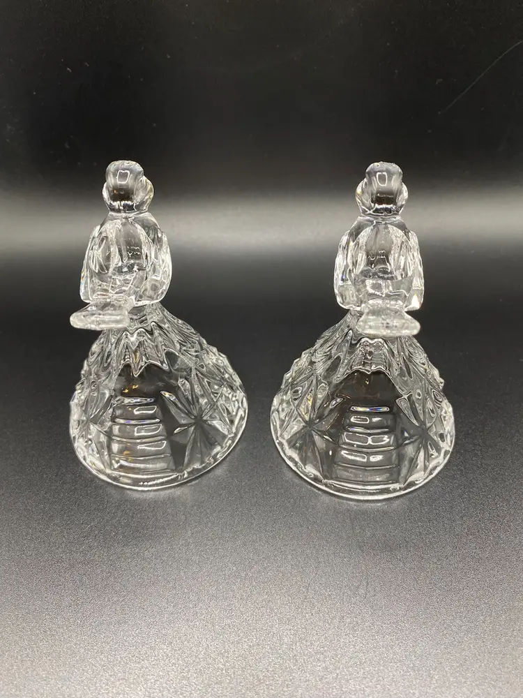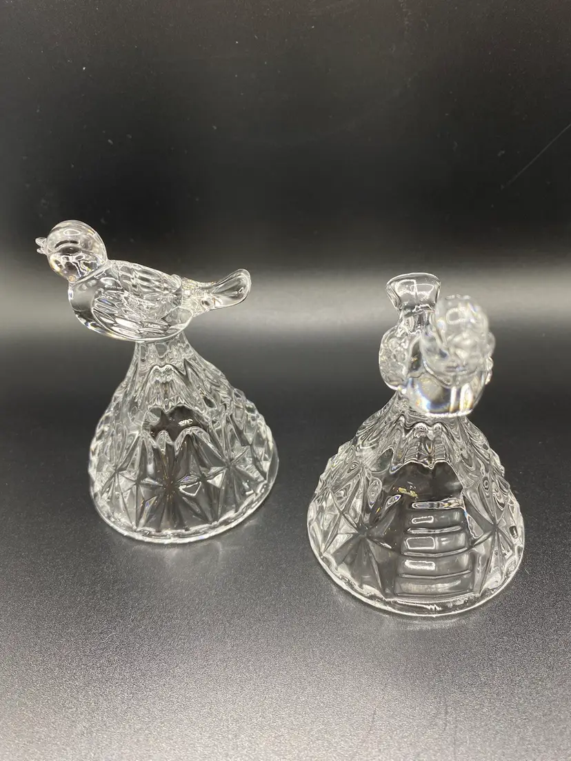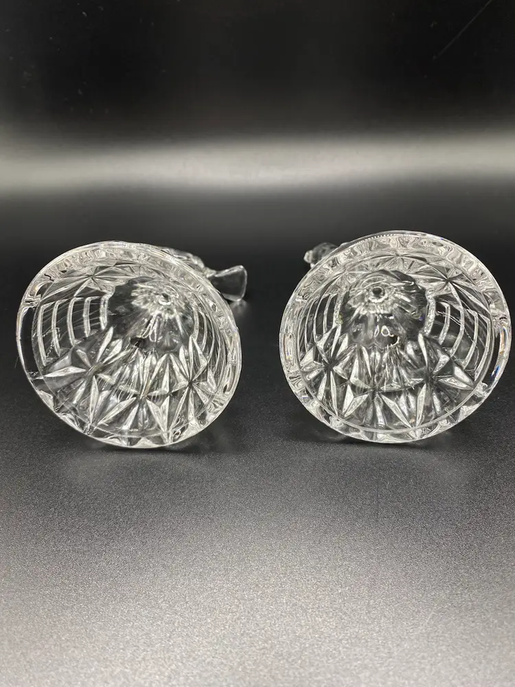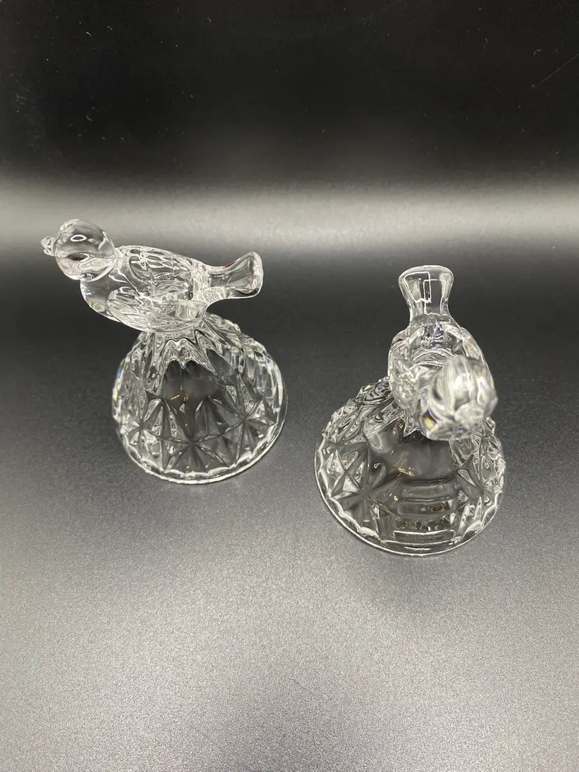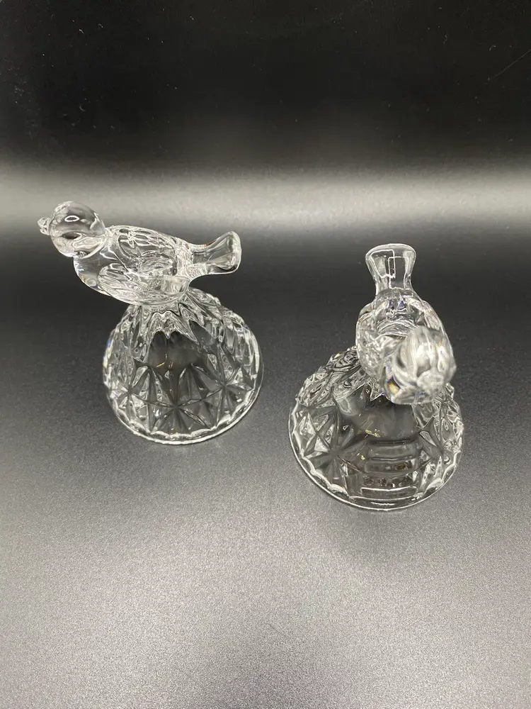 Set of 2 crystal candlesticks holders with birds on top. They are approximately 3-1/4” tall x 2-1/4” wide at base. No chips or cracks. Good condition.