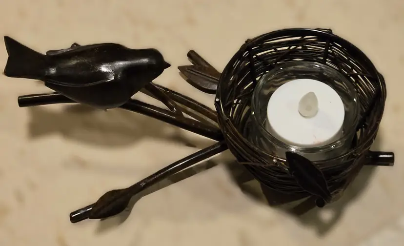 - vintage metal bird on branch sculpture - nest holds LED tea light candle
