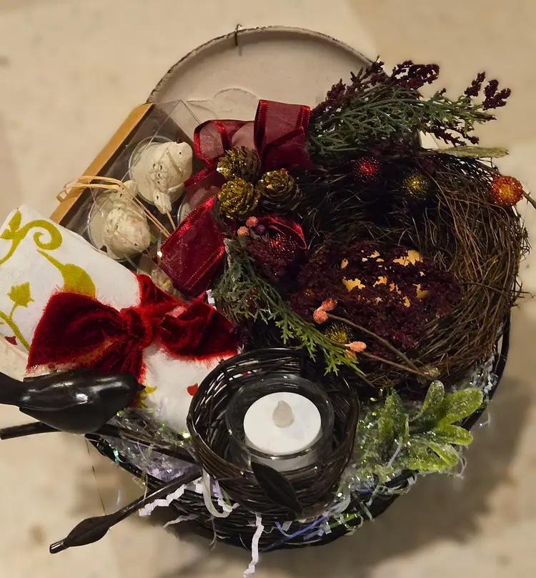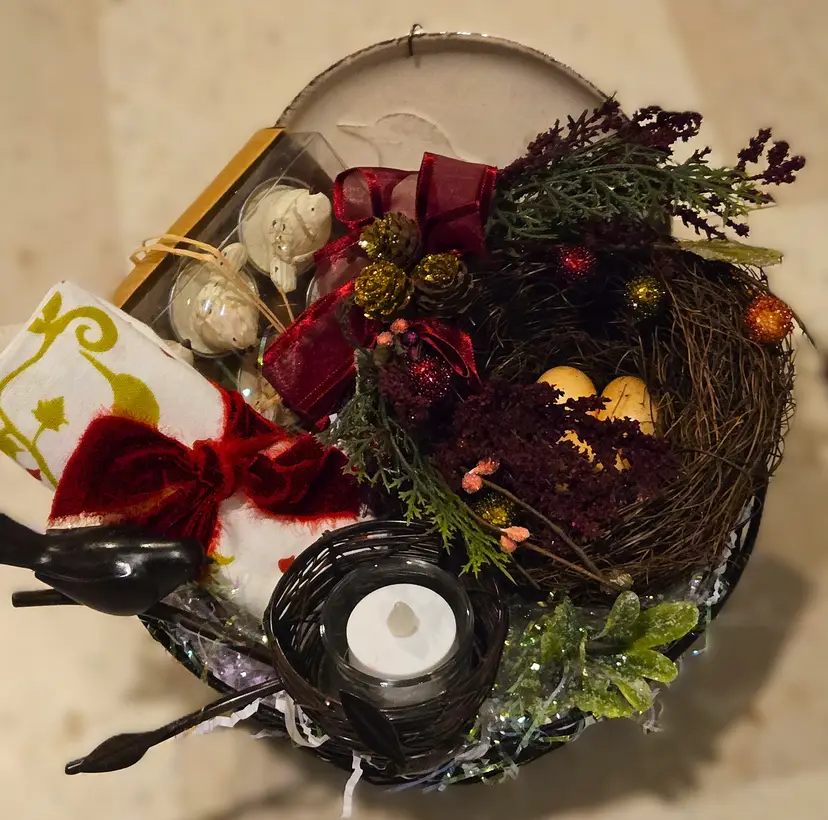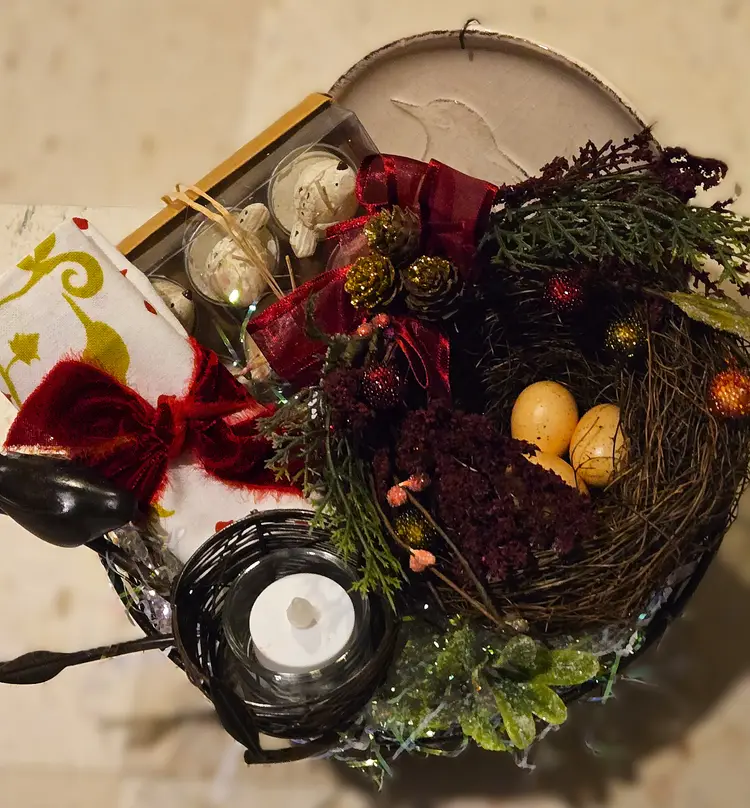 Newly curated with a vintage twist! Especially for the bird lover, this adorable gift is all about the beauty of the Winter season. Presented in a metal nest-shaped basket, this gift features: