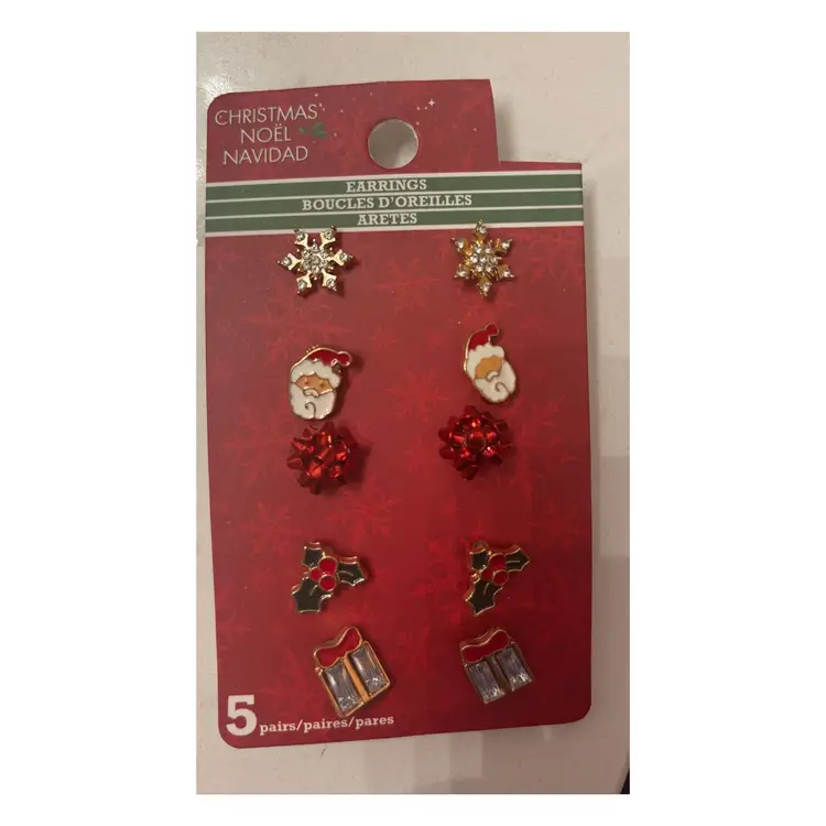 Festive stud earring set. Includes snowflakes, Santa faces, red bows, holly and gift charms. Gold tone accents with white and red enamel. Perfect holiday accessory.