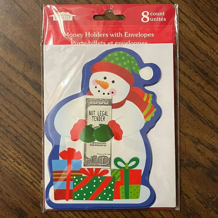 These holiday-themed money holders feature a charming snowman design, ideal for presenting cash gifts in a festive manner. Each pack contains eight holders with envelopes, providing a convenient and stylish way to gift money during the holiday season.