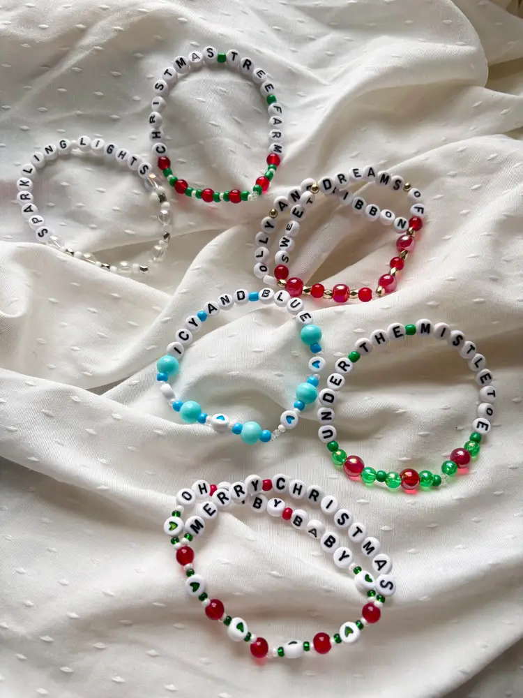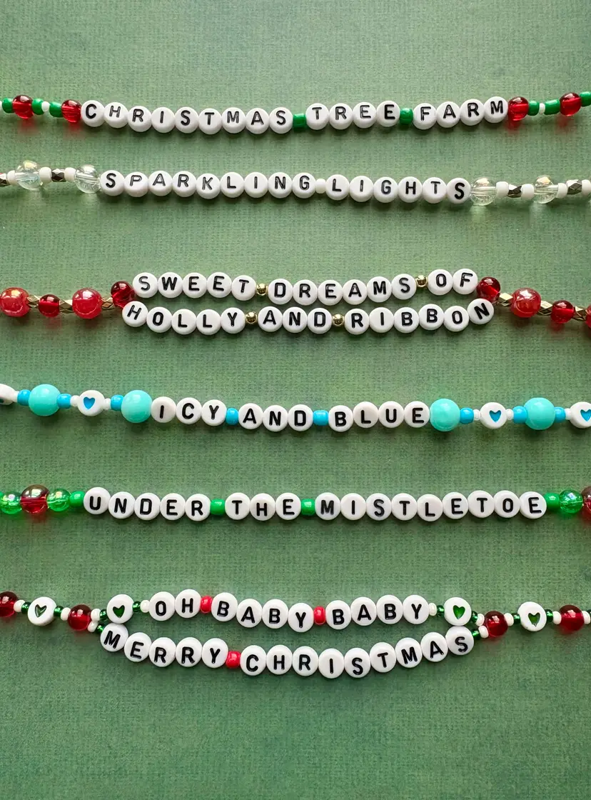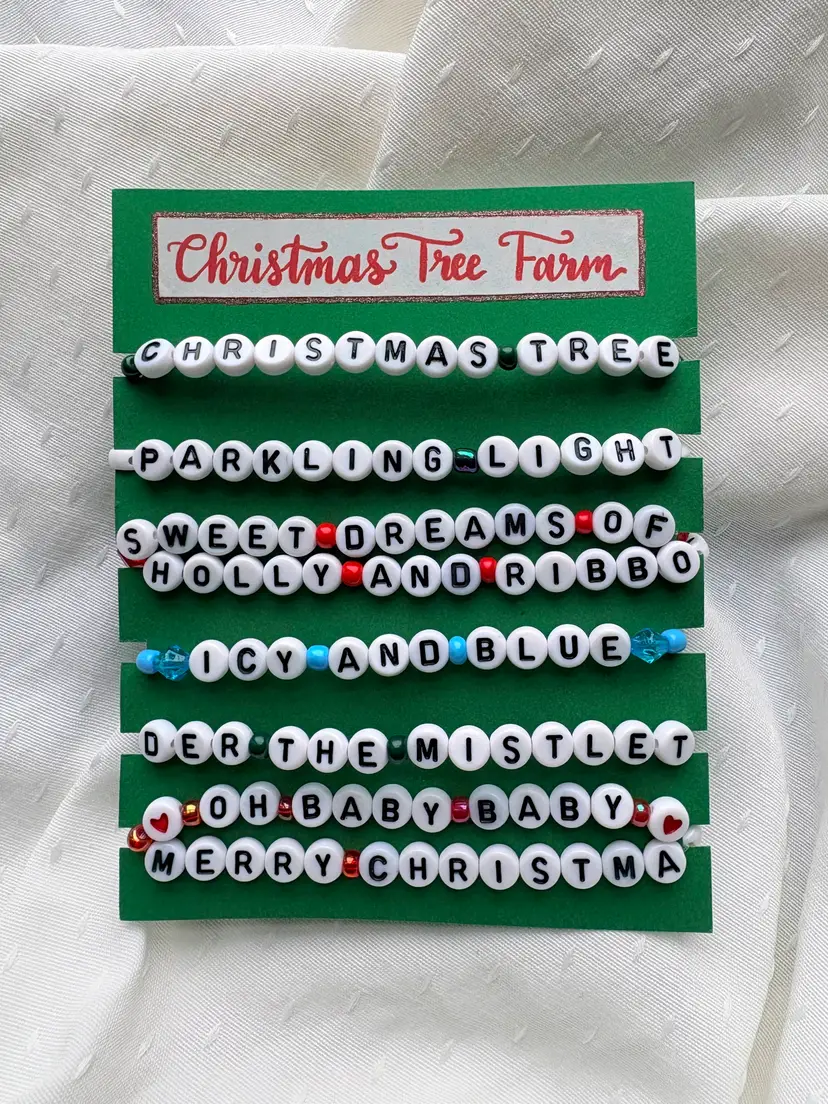 If you're having sweet dreams of holly and ribbon and friendship bracelets this holiday season, check out this "Christmas Tree Farm" inspired bracelet set! ๐ The bracelets you receive will say the same lyrics as those in the pictures. The set includes two double-strand bracelets. The bracelets are made with stretch elastic and do not have clasps. They are each approximately 6.5 inches in length.
