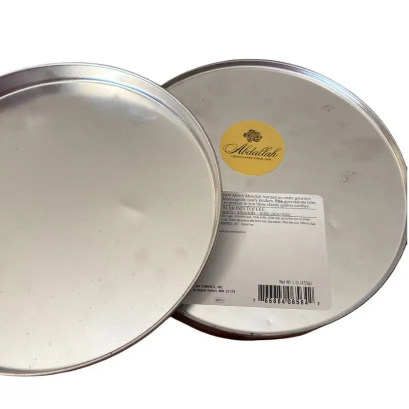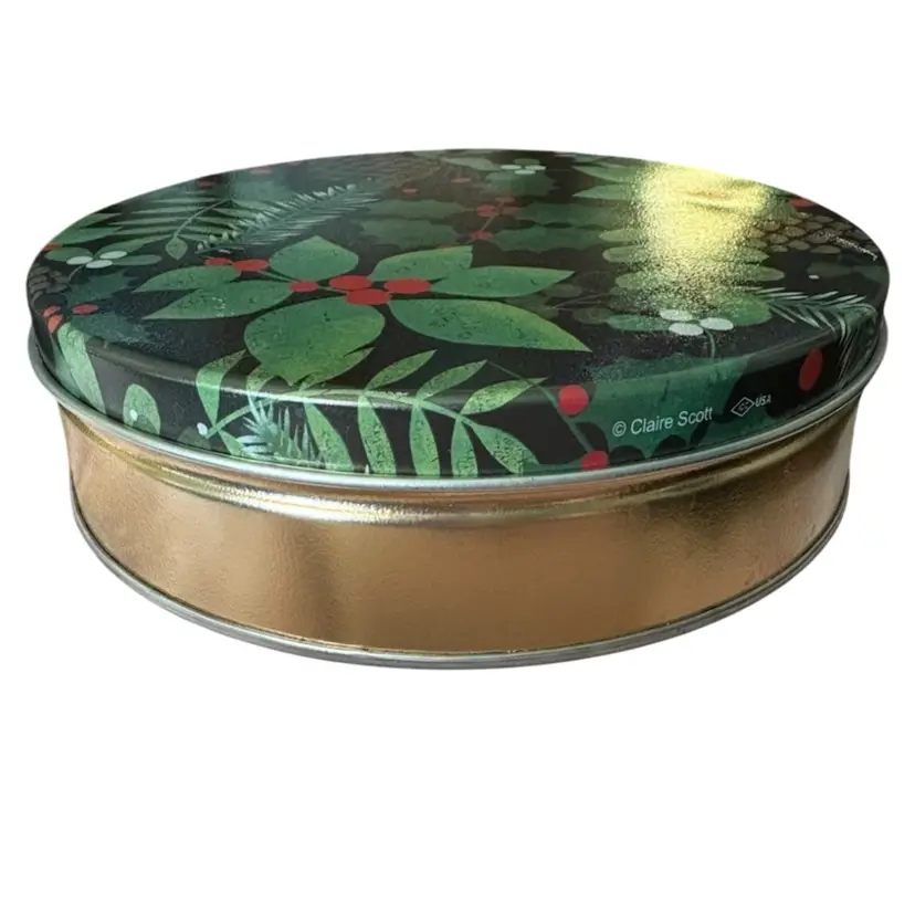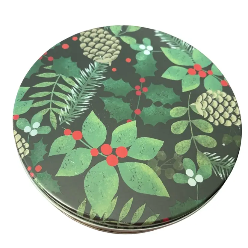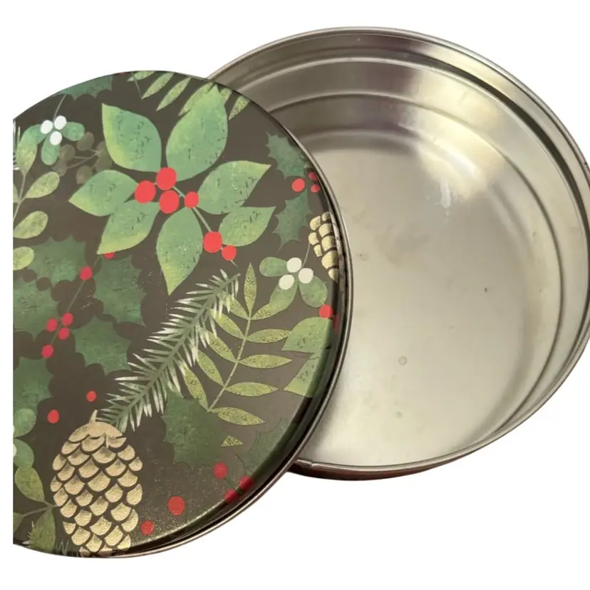 Holiday Tin 6.75 x 2 inches Holly leaves, berries and pine cones