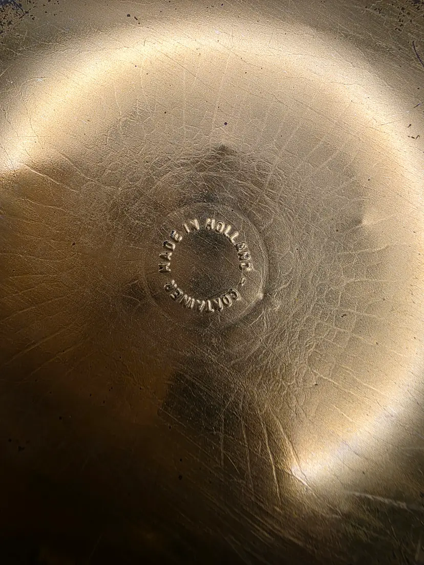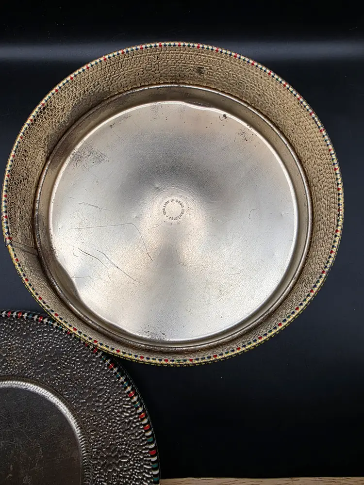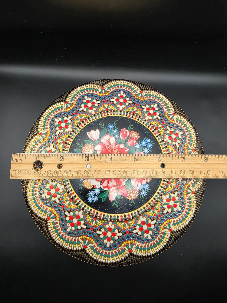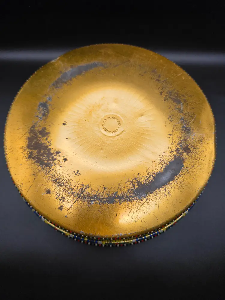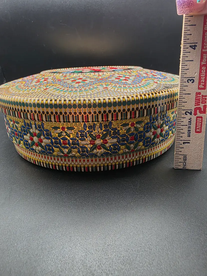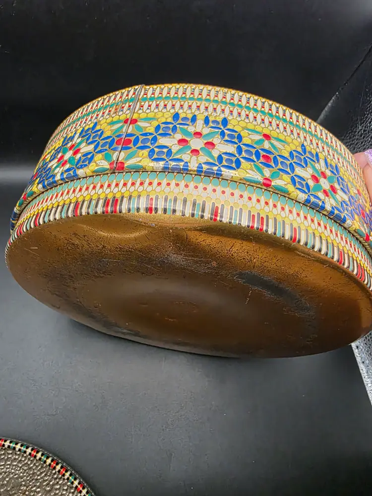 Please see pictures. Tin has a few dents nothing major! Missing gold paint on the bottom! Textured very ornate mosaic floral tin!