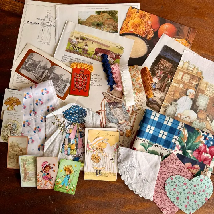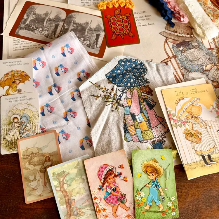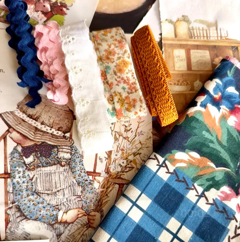 These bundles are loaded with Prairie goodness and each contains a touch of rare, Holly Hobbie, authentic ephemera plus 4 1/2 yards of vintage trims, playing cards, vintage invitation, book pages and a fat quarter and other coordinating remnants. Each kit is a bit different as you can see in the pictures. Please contact me in the chat here on Districts if you have any questions.