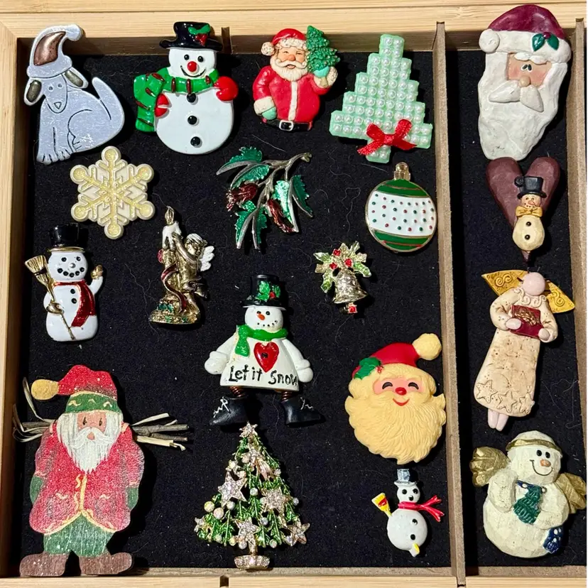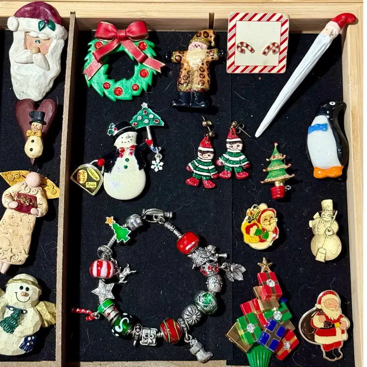 32 pieces: 29 brooches; 2 pairs of earrings; 1 charm bracelet (missing one charm).