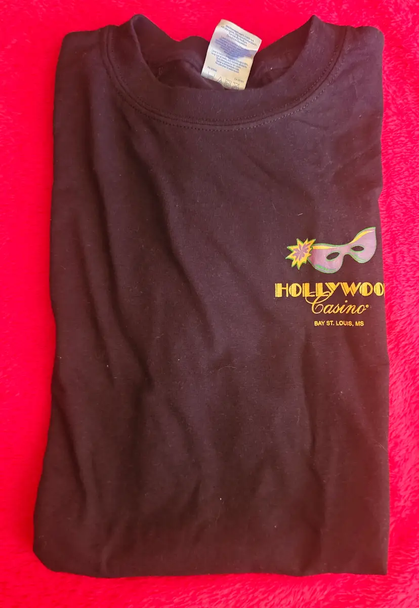 The Hollywood Casino Bay St. Louis - Mardi Gras '07 T-Shirt in size XL features a graphic print design with a black color and short sleeves. Made from a comfortable cotton blend material, this regular fit shirt is perfect for the summer and spring seasons. Designed by gildan, this men's clothing item is machine washable for easy care and is ideal for adding a touch of style to your wardrobe with its graphic tee style.
