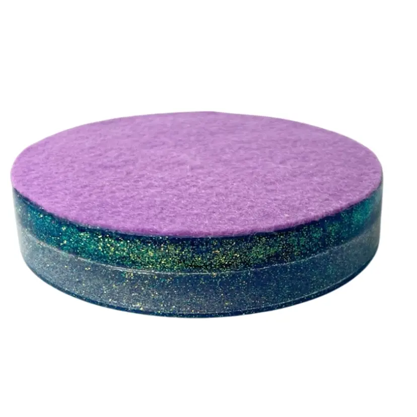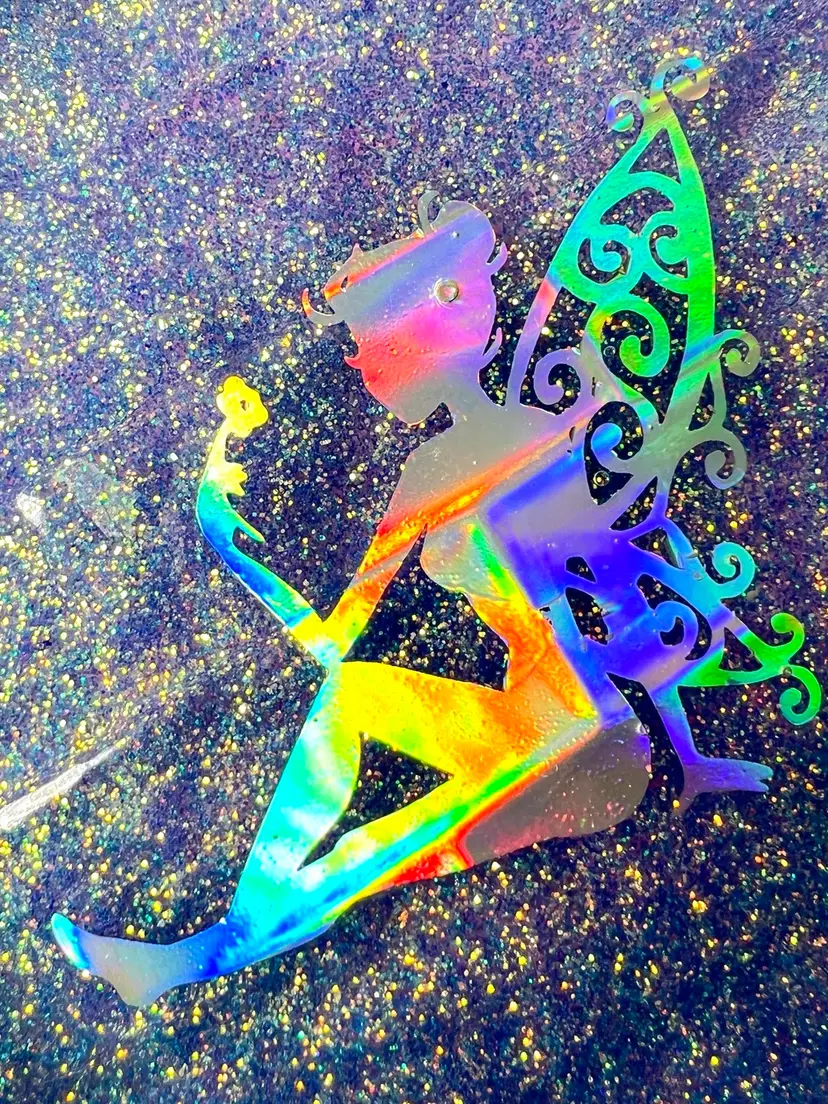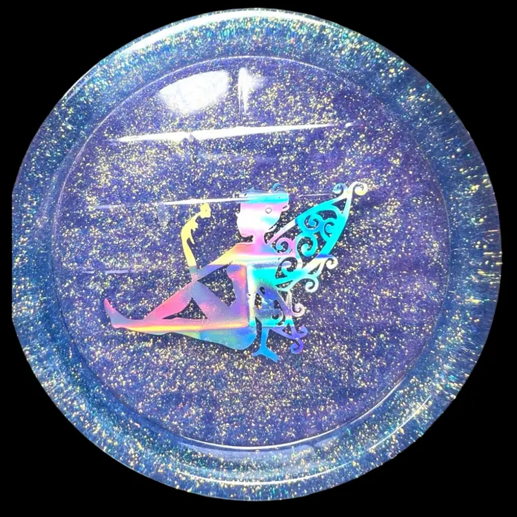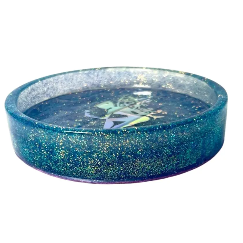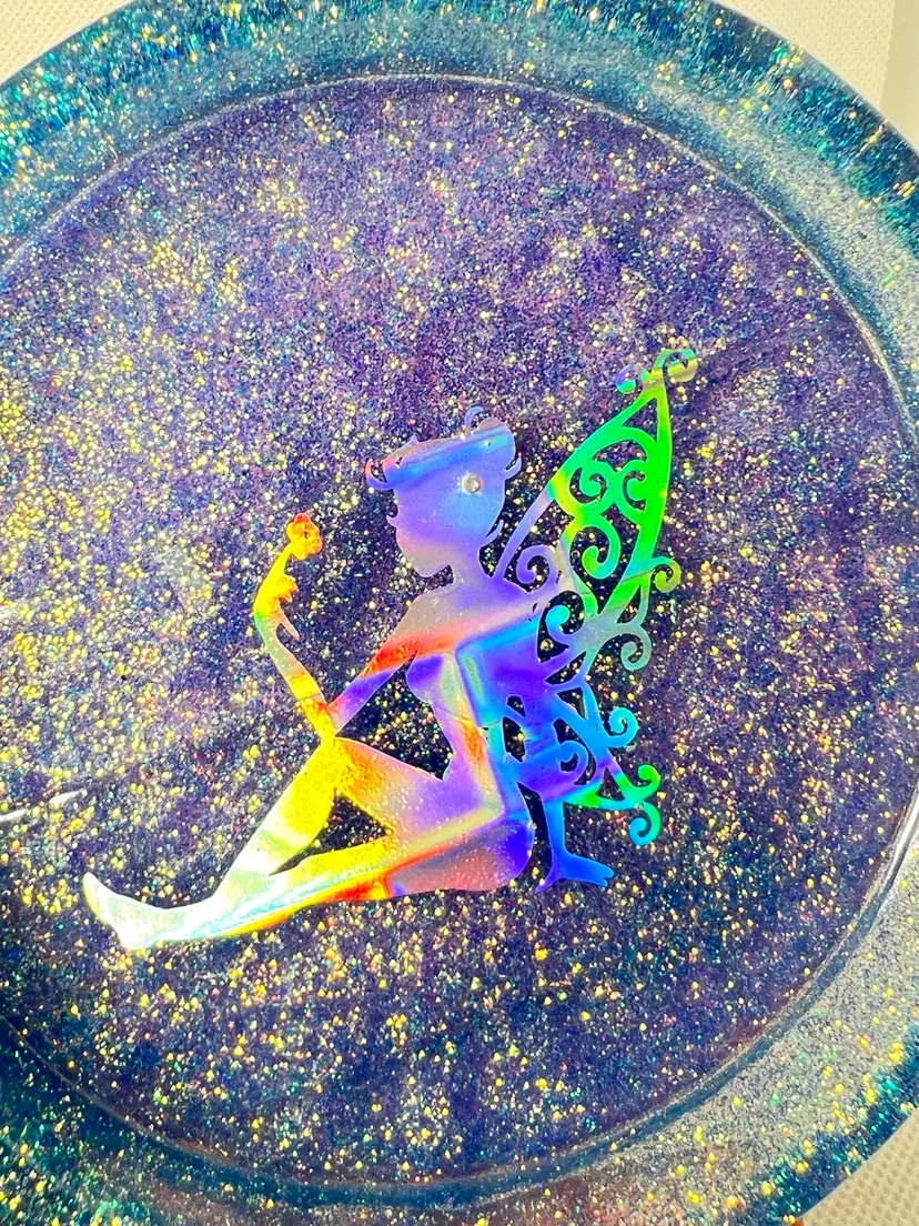 Handmade by me 🫶 Resin and pretty sparkling periwinkle glitter Holographic fairy insert Lavender colored felt bottom to protect surfaces 4-3/4” diameter x 1” tall. 1/2” depth inside tray. Note small bubble in fairies hair. Weighs 6-1/2 ounces