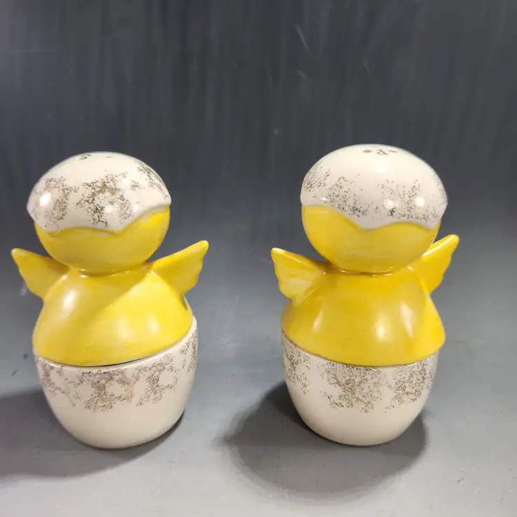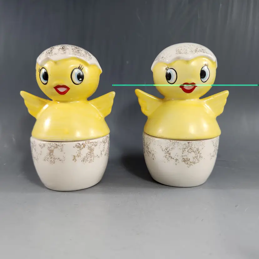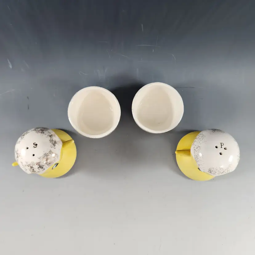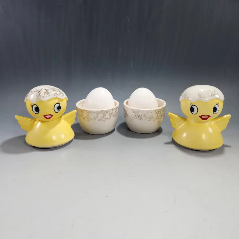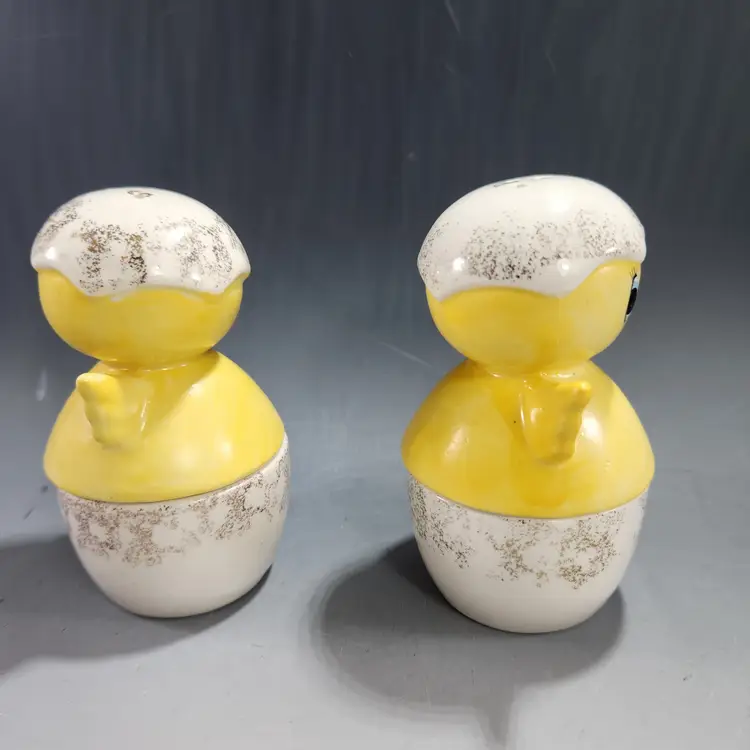 So cute for Easter or anytime! Set of marked (HH) "Slick Chick" combination salt & pepper/egg cup set by popular designer Holt Howard, likely from the 1960s. These come apart so you can put your hard boiled egg in the bottom and with the tops you can season them. A wonderful kitschy addition to your vintage kitchen decor. Has the original Holt Howard Japan label.