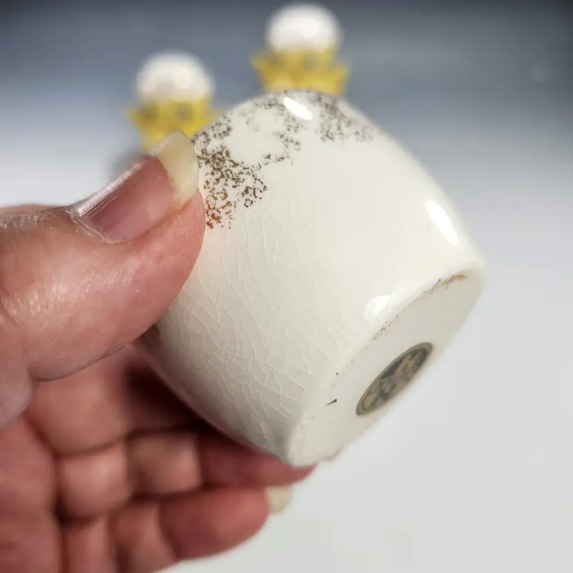 Condition: Excellent. I am not seeing any chips or cracks. S & P tops have their original stoppers. The bottom cup portion are finely crazed, typical of ceramics of this era.