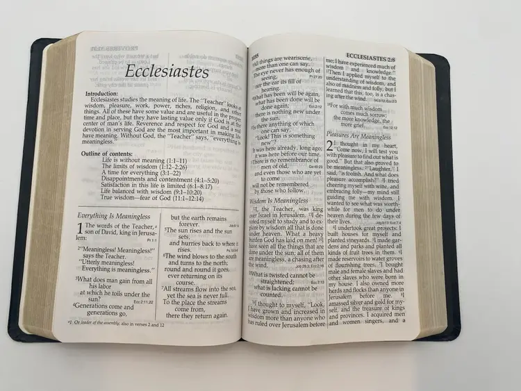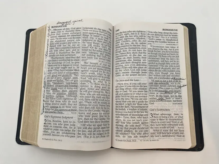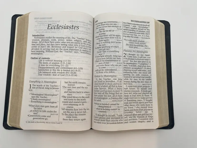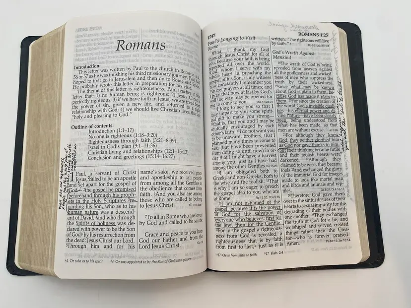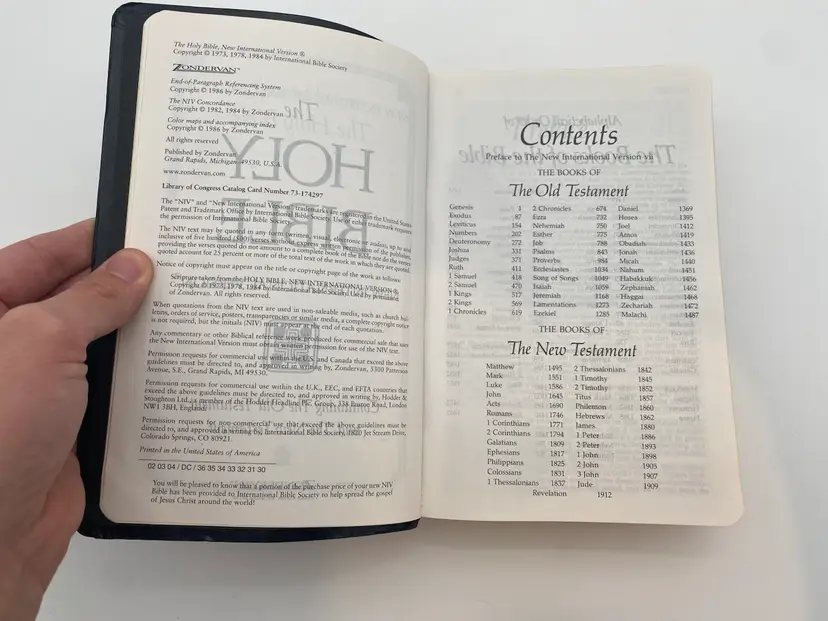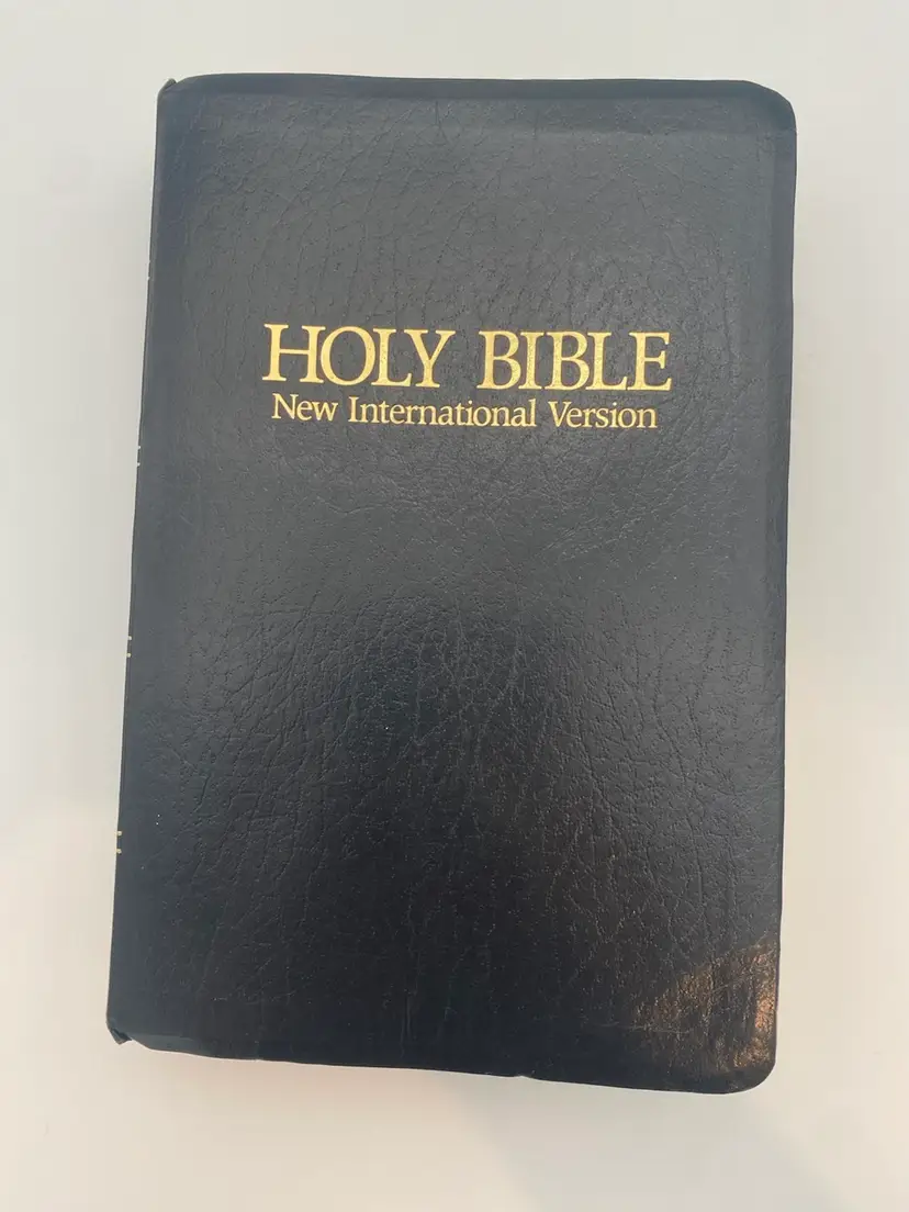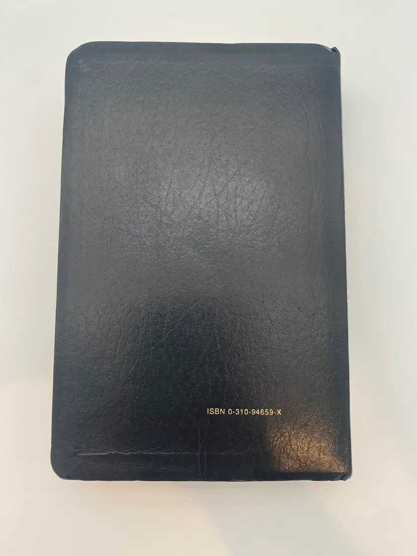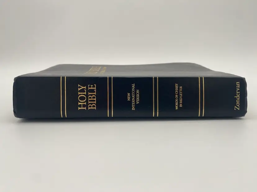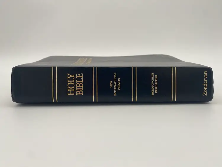 You are purchasing one Black Leatherette Holy Bible: New International Version w/ Words of Christ is Red Letter by Zondervan from 1986. This Bible is in overall good condition with no issues with the Binding. Pages have no rips, stains or folds, just see final two images to show 4 pages have writing on them.