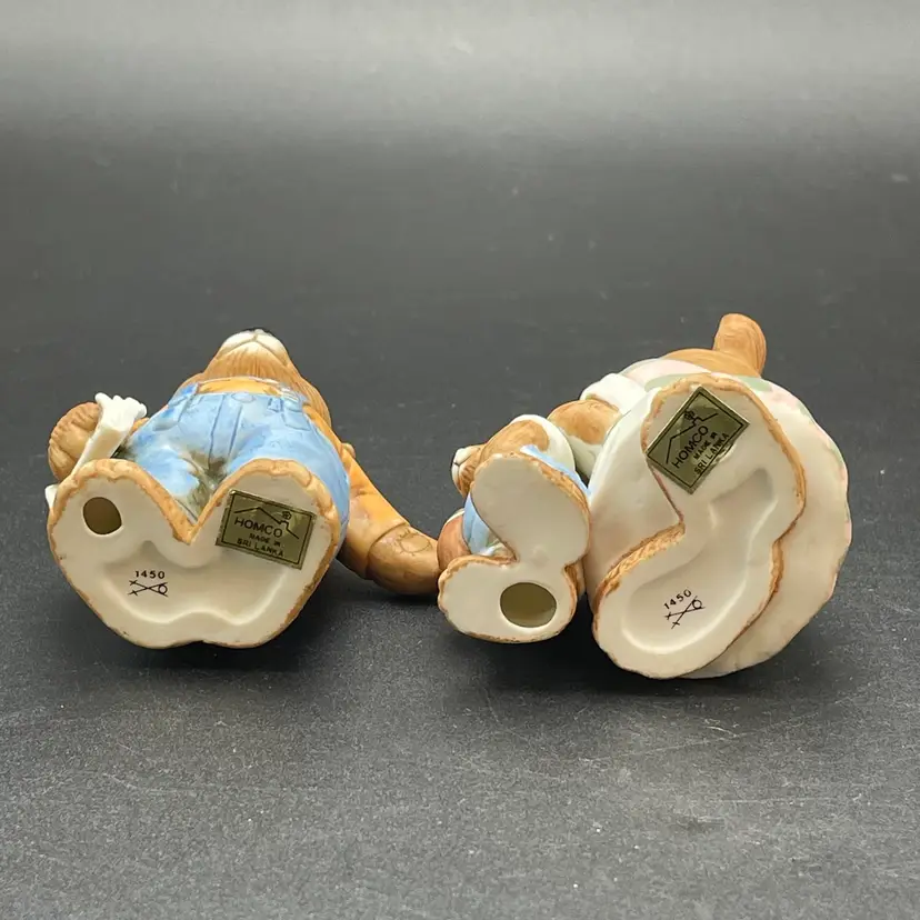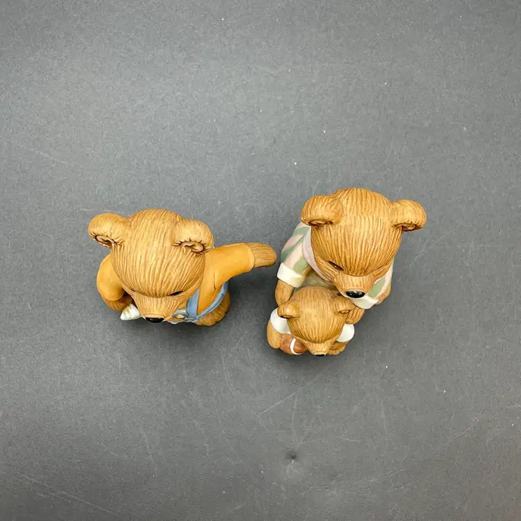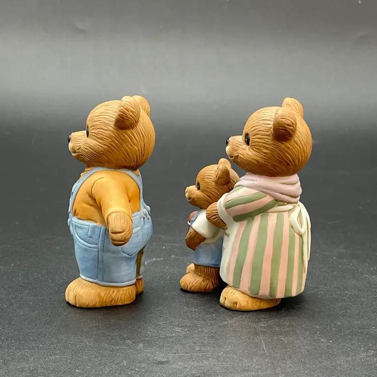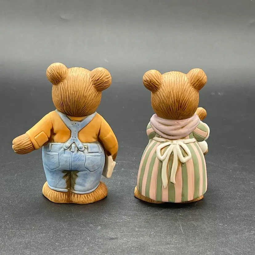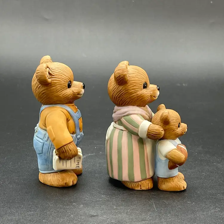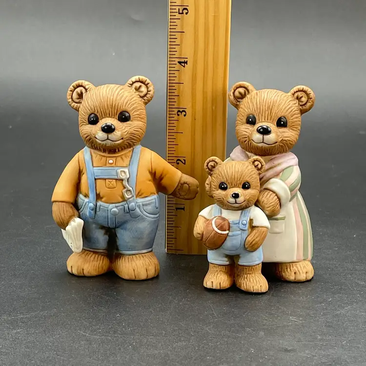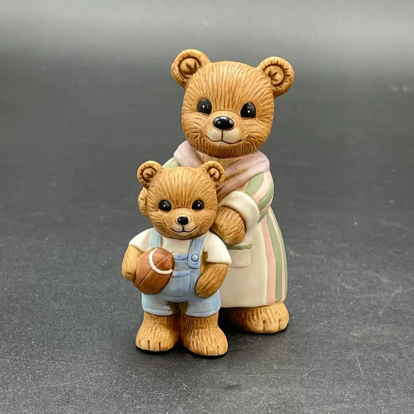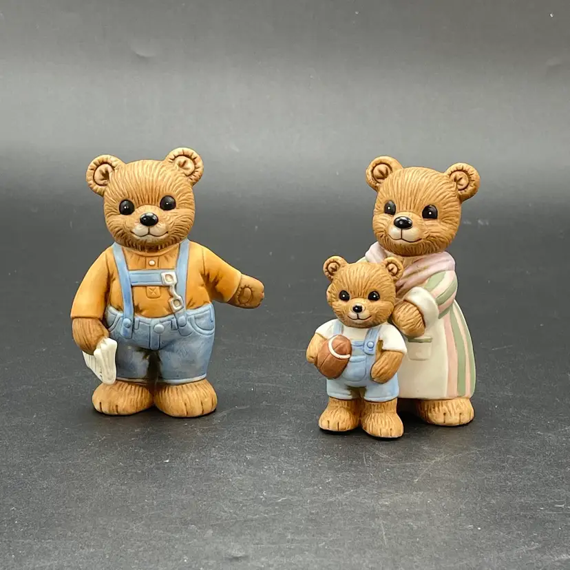 This is a vintage set of 2 Homco #1450 football bear family figurines. The set includes a papa bear and a momma with son bears. Marked on the bottoms. Each measure approximately 3.75" tall. No major