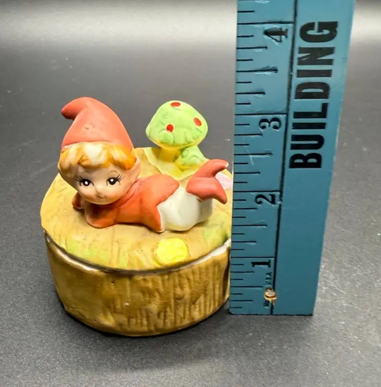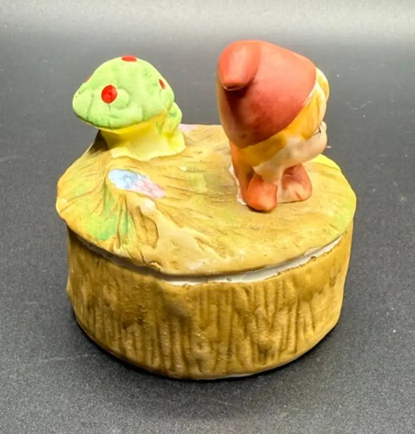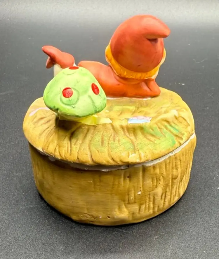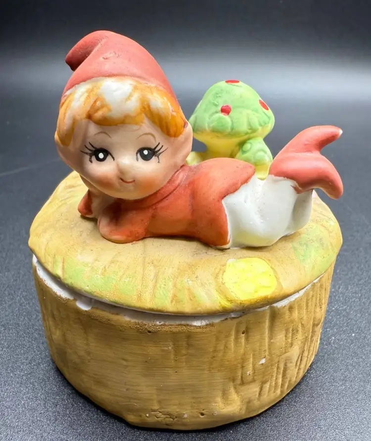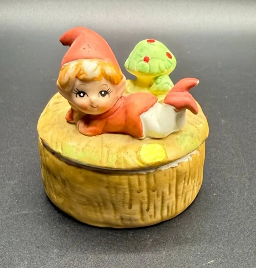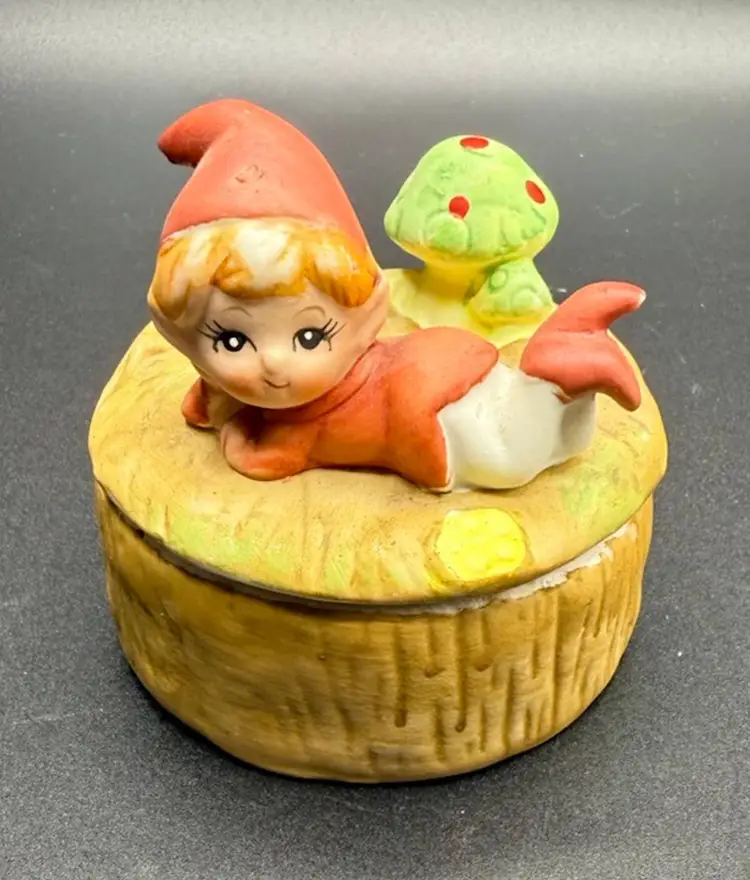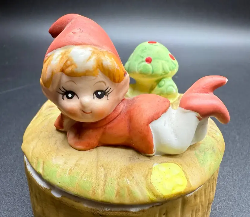 Description: This is a hand-painted ceramic trinket box from Homco #5404. This vintage Pixie Elf Garden Gnome created by Homco in the 1970's. Homco, Home Interiors and Gifts was a direct sales company for home decor, through home parties & saleswomen. It was founded in 1957 by Mary C. Crowley. This company closed in 2008.