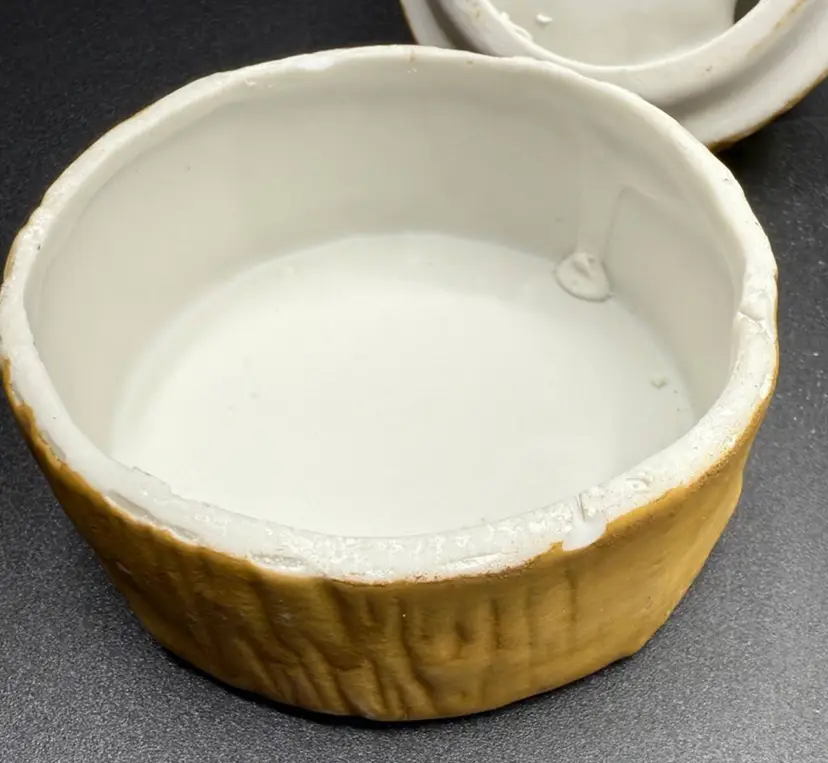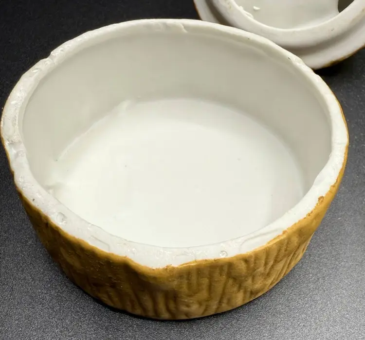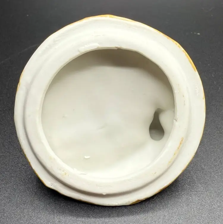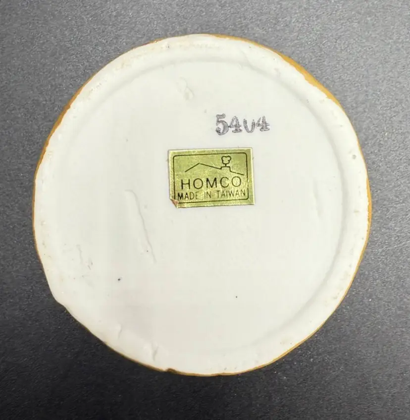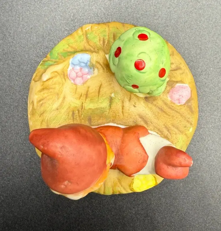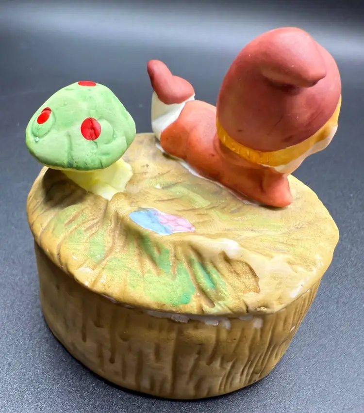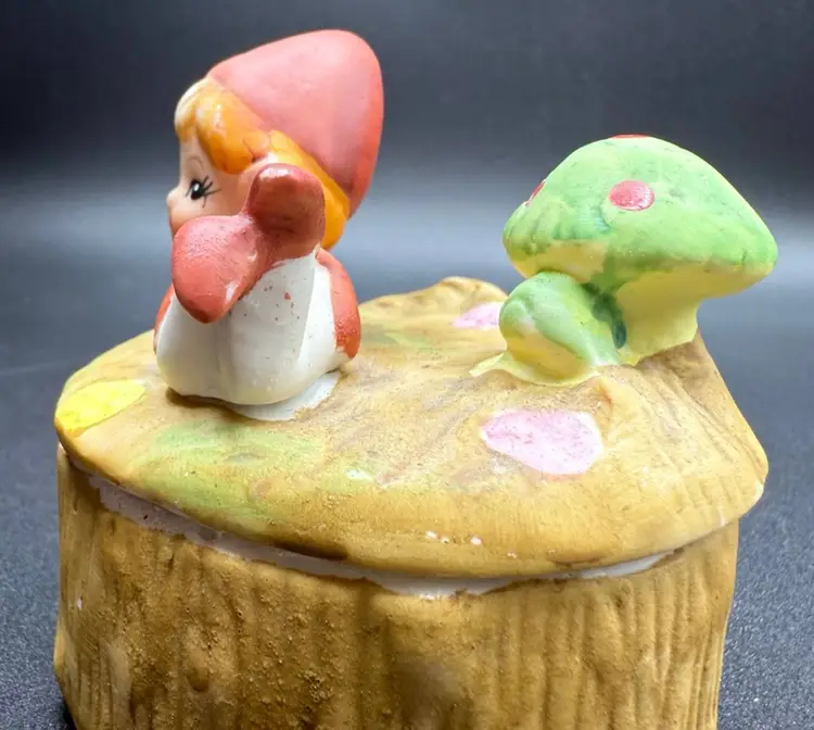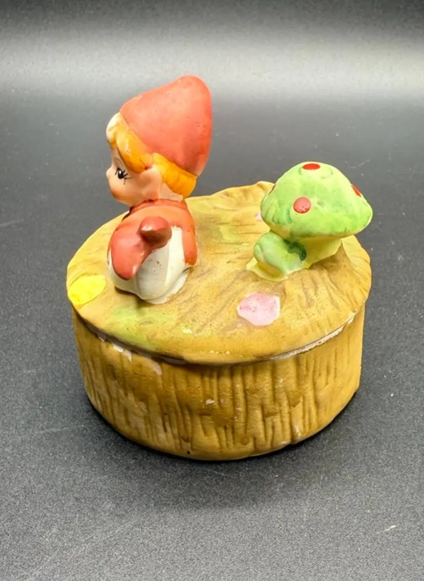 Description: This is a hand-painted ceramic trinket box from Homco #5404. This vintage Pixie Elf Garden Gnome created by Homco in the 1970's. Homco, Home Interiors and Gifts was a direct sales company for home decor, through home parties & saleswomen. It was founded in 1957 by Mary C. Crowley. This company closed in 2008.