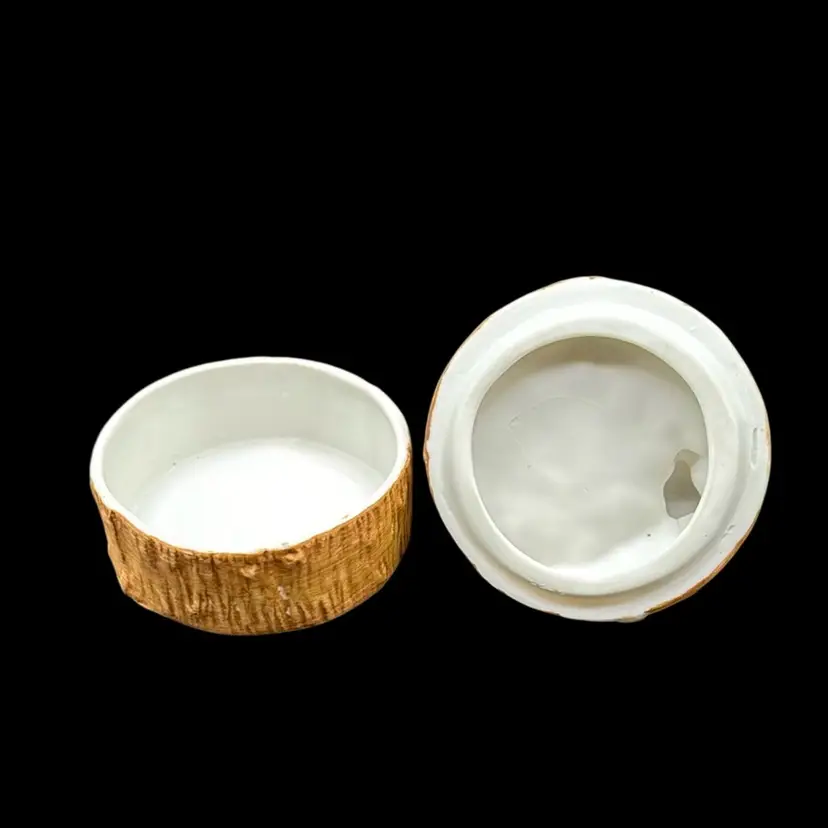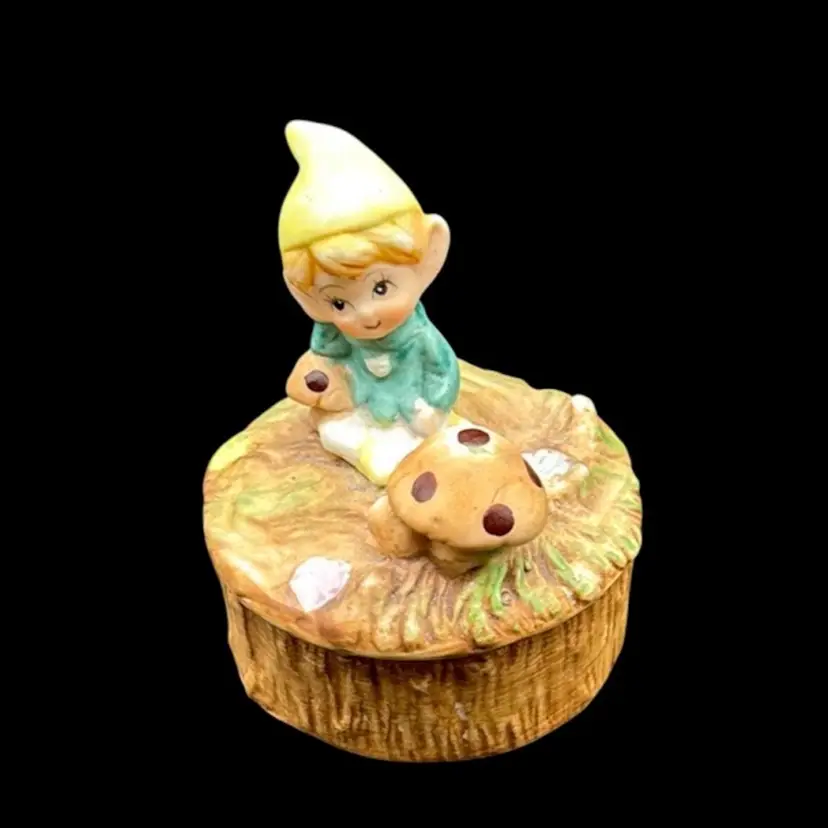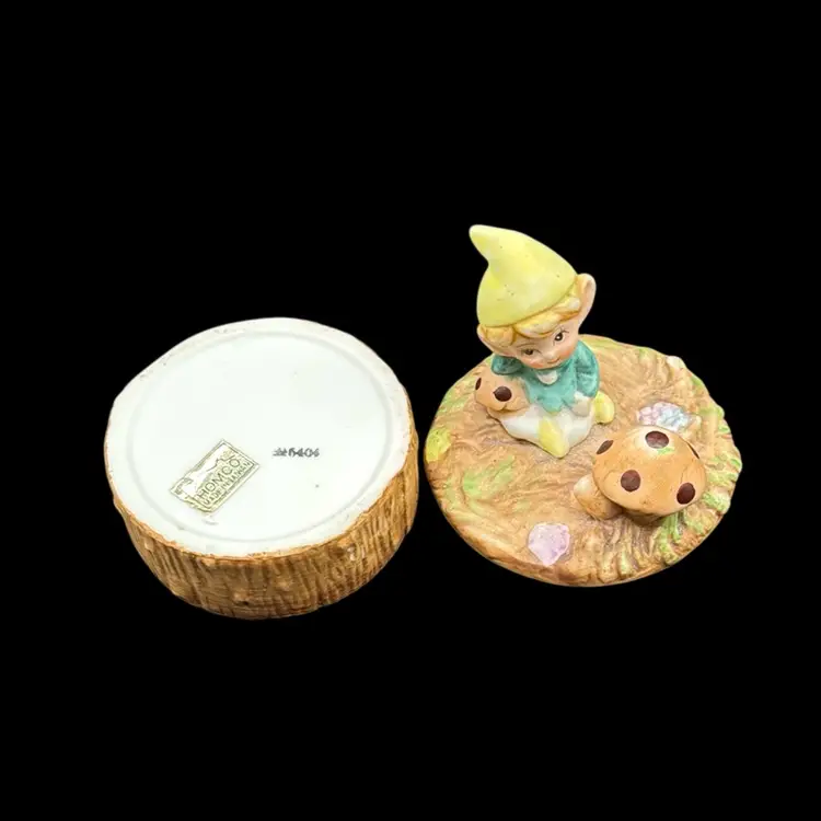 Homco Precious Pixie Mushrooms On Stump Porcelain Trinket Box Stickered No Noted Flaws 3 1/4”