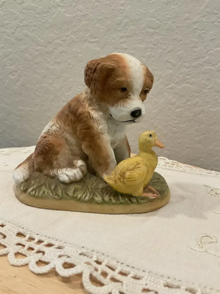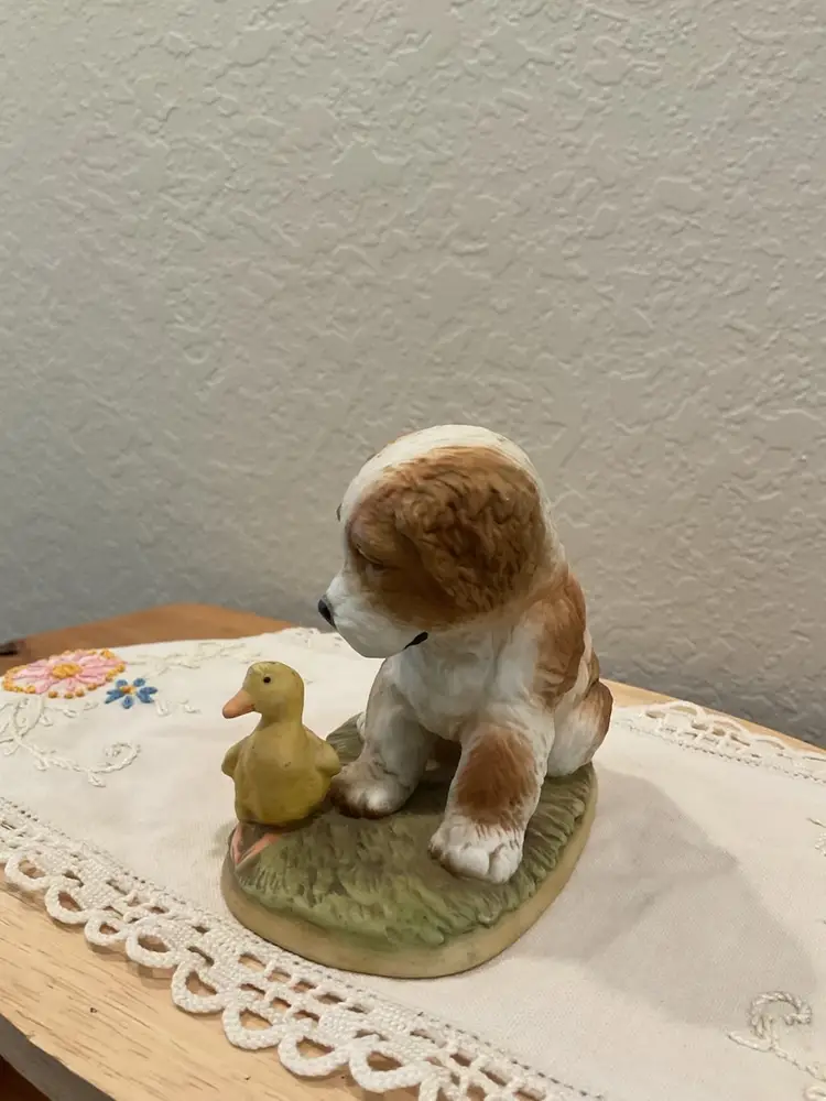 This item is a vintage Homco porcelain puppy dog with a duckling figurine. It is a decorative collectible piece often used for home display