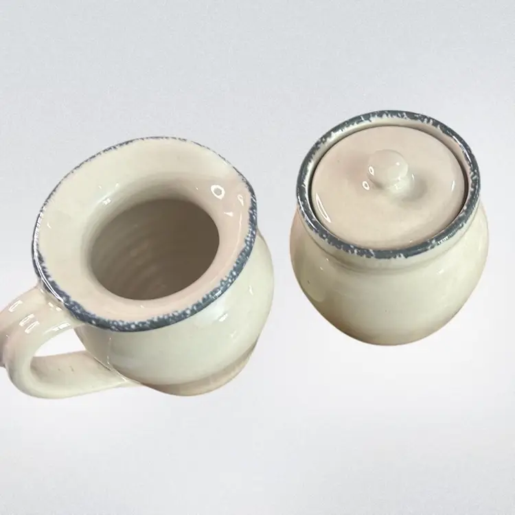No chips or cracks. Stoneware. Creamer 4 1/4 inches high 5 1/2 inches wide.. sugar 3- 3/4 inches high by 3 -3/4 wide