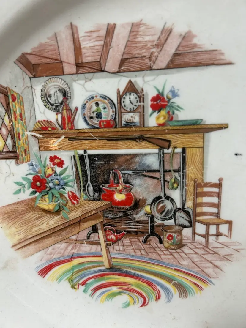 vintage Homer Laughlin "Colonial Kitchen" oval serving platter. This specific platter is known for its fireplace mantel pattern and gold trim. Circa 1940s-1950s