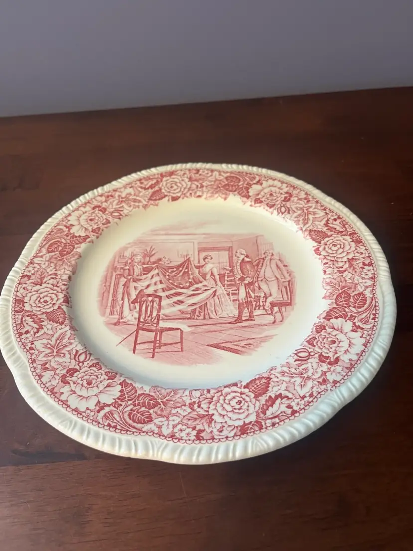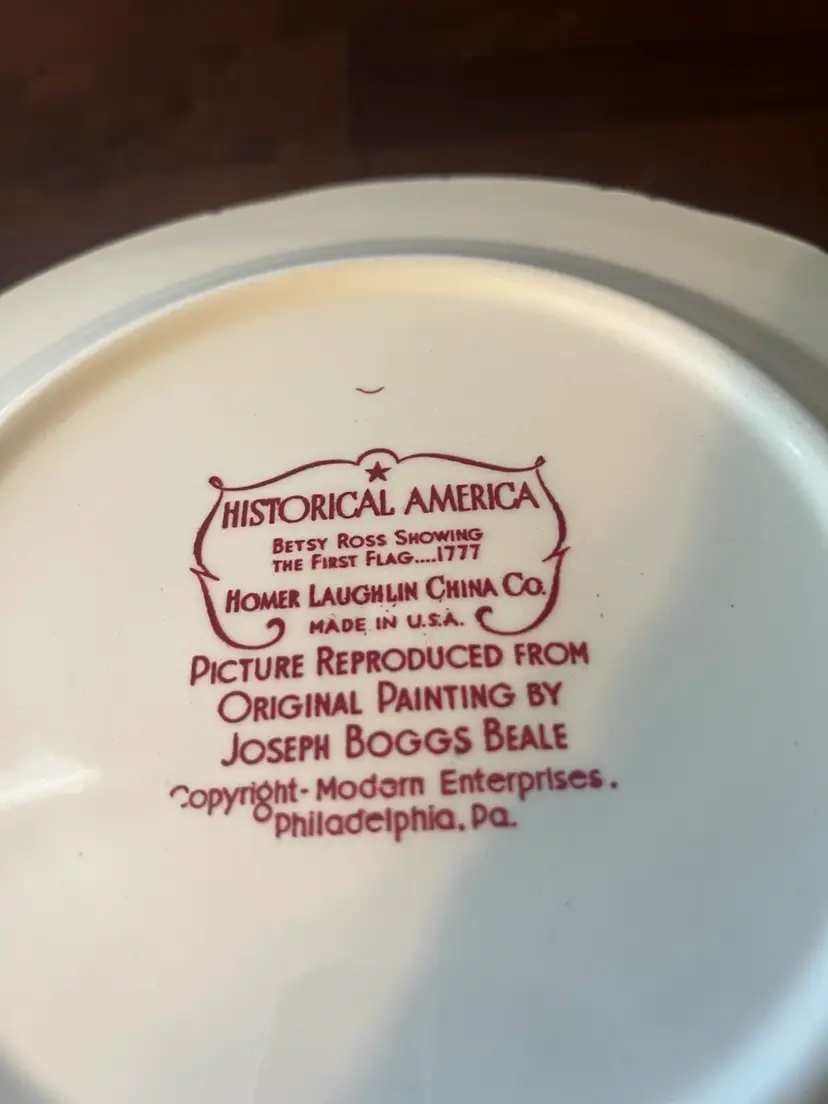 The "Historical America" series by Homer Laughlin often features scenes from American history, making these plates collectible items that appeal to those interested in Americana and historical ceramics. The depiction of Betsy Ross and the creation of the first American flag is a classic motif, symbolizing patriotism and early American craftsmanship. These plates were produced to commemorate significant historical events and figures, serving both decorative and educational purposes.