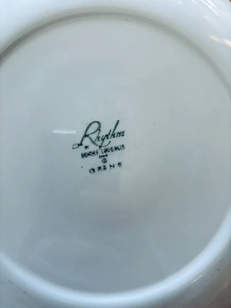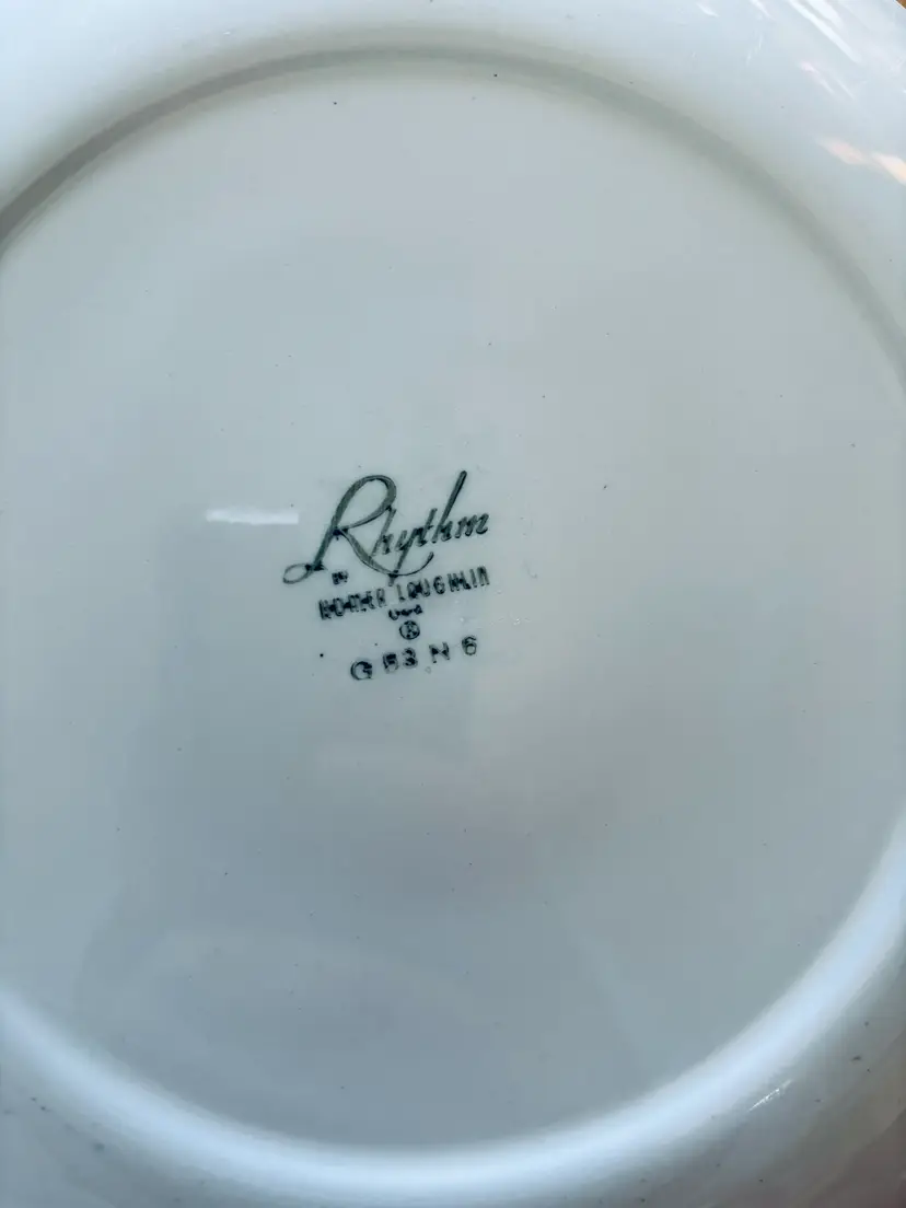 This Homer Laughlin China Company dinner plate features multiple large Pink Magnolias blossoms and green leaves with a gold rim. Beautiful vintage condition. 3 available