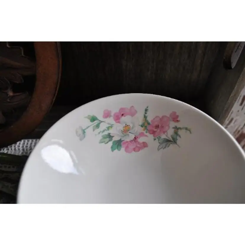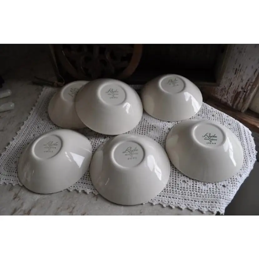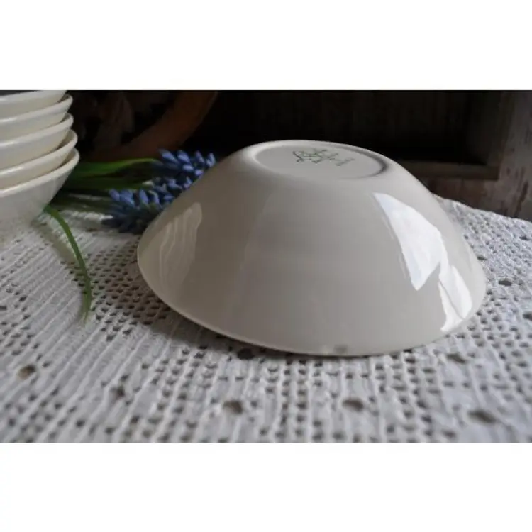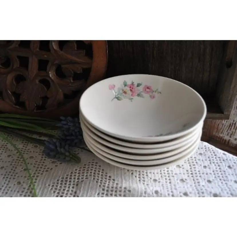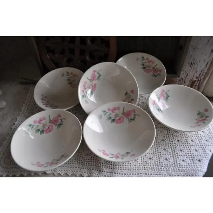 Homer Laughlin "Rhythm" set of 6 fruit bows Measure 5 1/2" in diameter by 2" deep Sweet wild rose pattern. Great for mixing with other patterns for a pretty vintage look. Grandmas dishes are in big demand. One bowl has a chip on back but will not affect use. See photos for details.