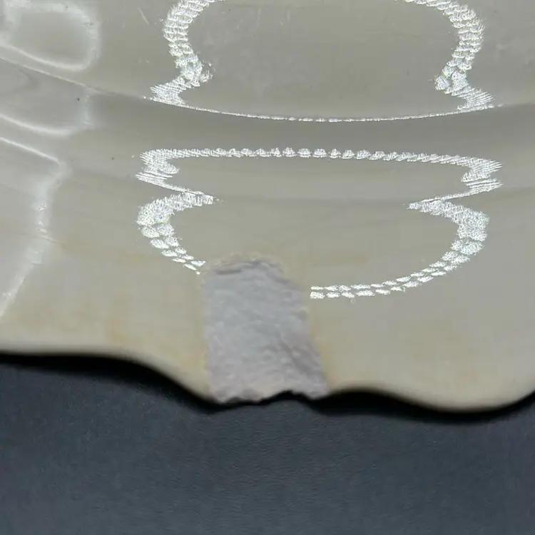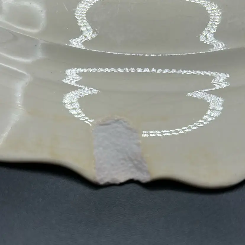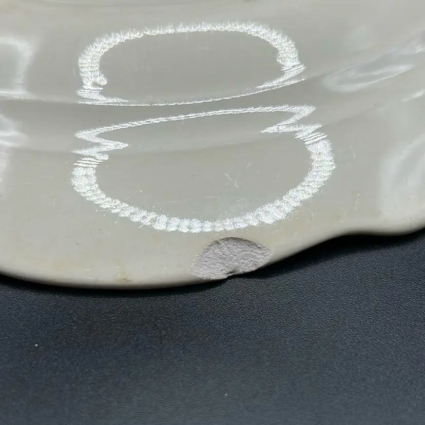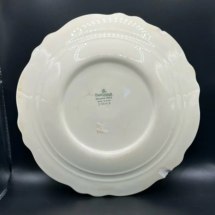 This piece is a Homer Laughlin 9 inch plate in the Virginia Rose pattern. There are 2 significant chips on the rim on the back. Homer Laughlin is the predecessor of Fiesta.