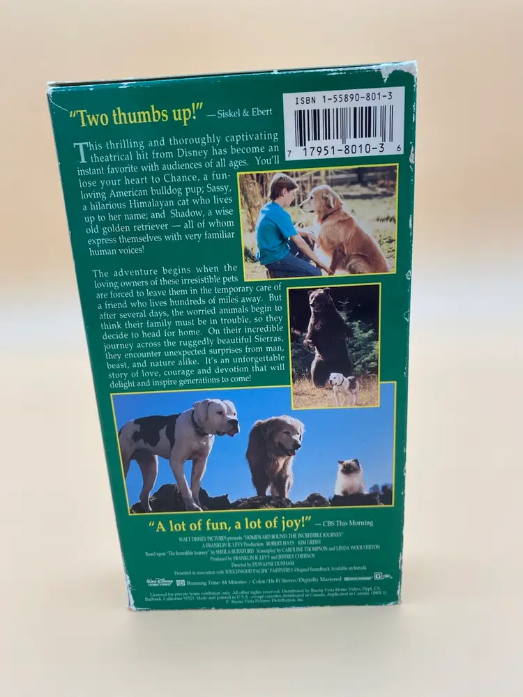 You are purchasing one Homeward Bound: The Incredible Journey VHS Movie by Walt Disney Pictures from 1993. This VHS is in overall good condition. Slipcover has minor wear that can be seen in the images. Tape is in great condition with no cracks, chips or molding.