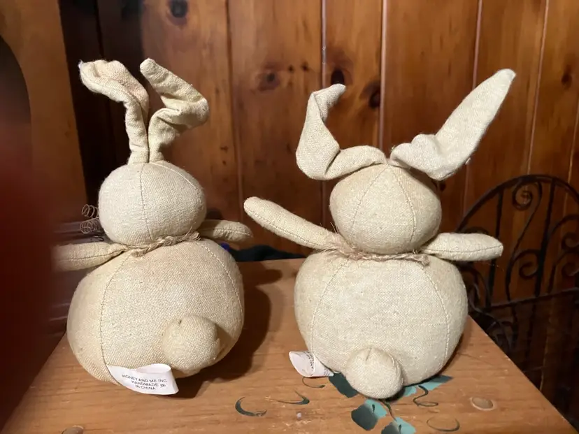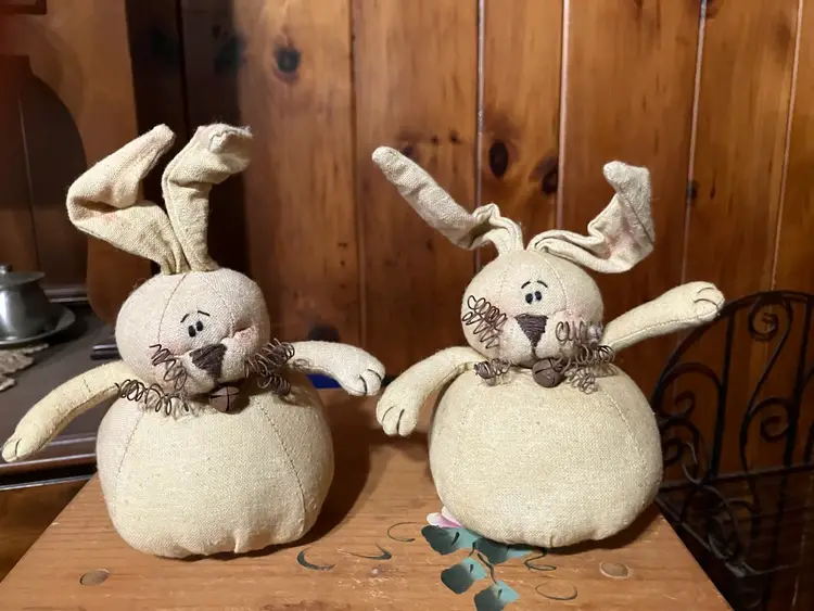 Honey & Me Rustic Cloth Rabbit. “Lance the Hare”. Portable ears, rustic whiskers & bell accents. Set of 2 Rabbits. 5” X 5”.