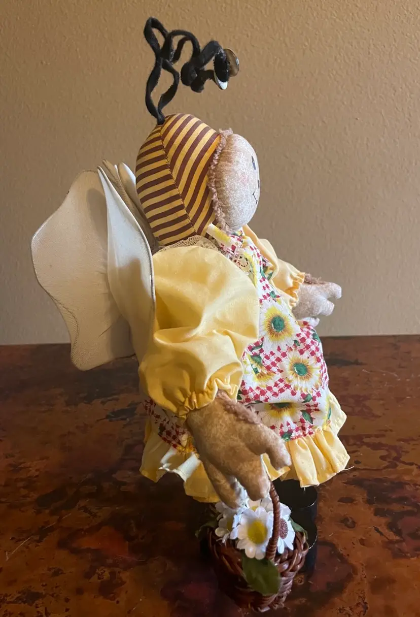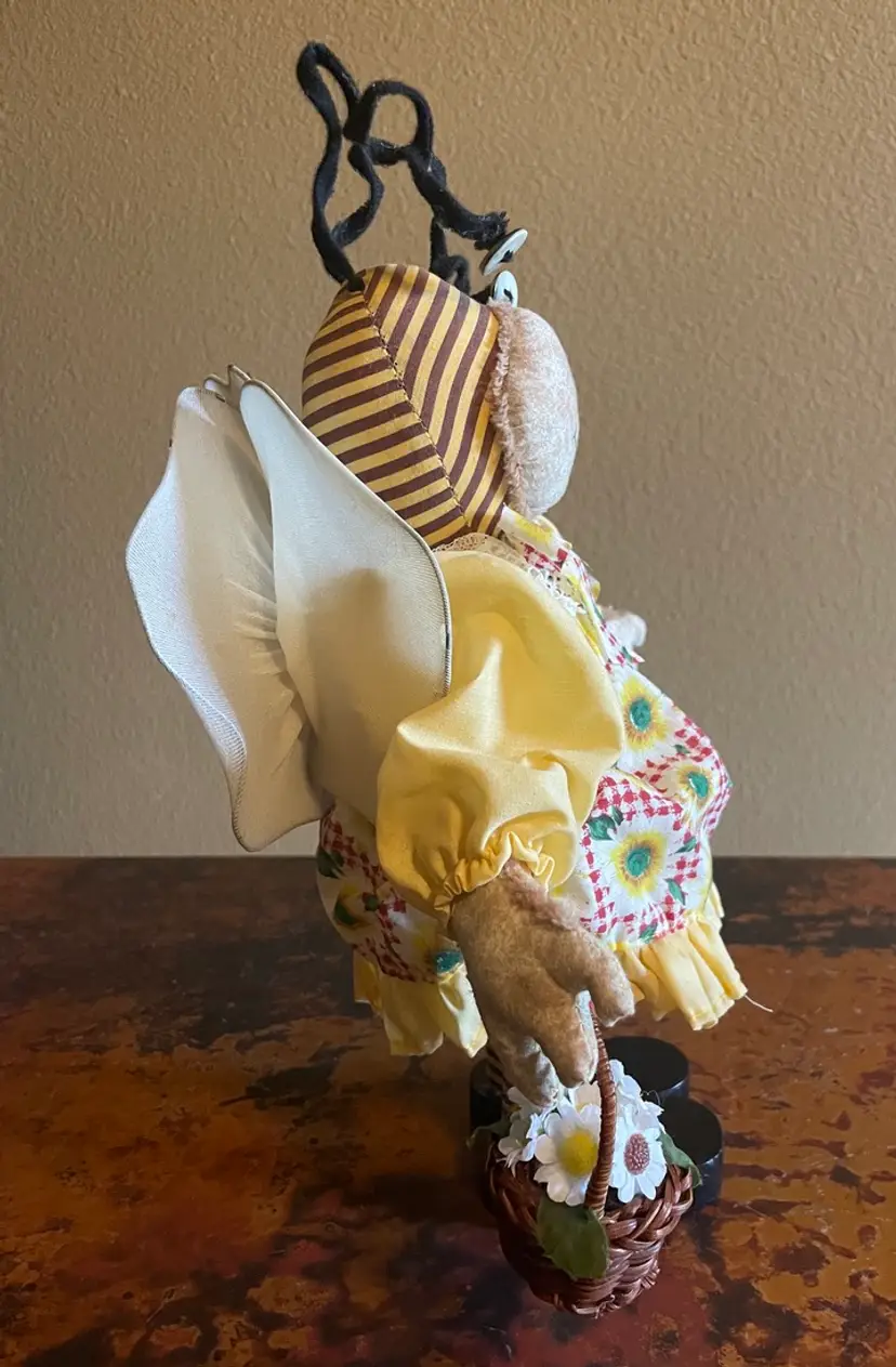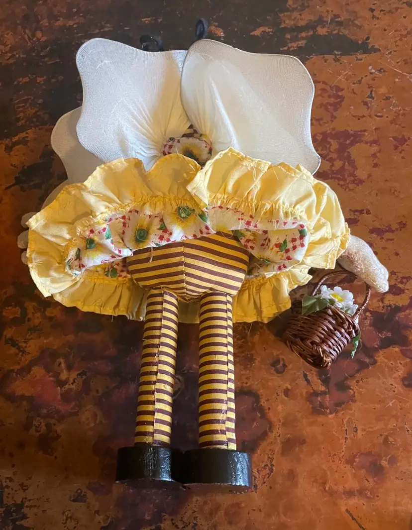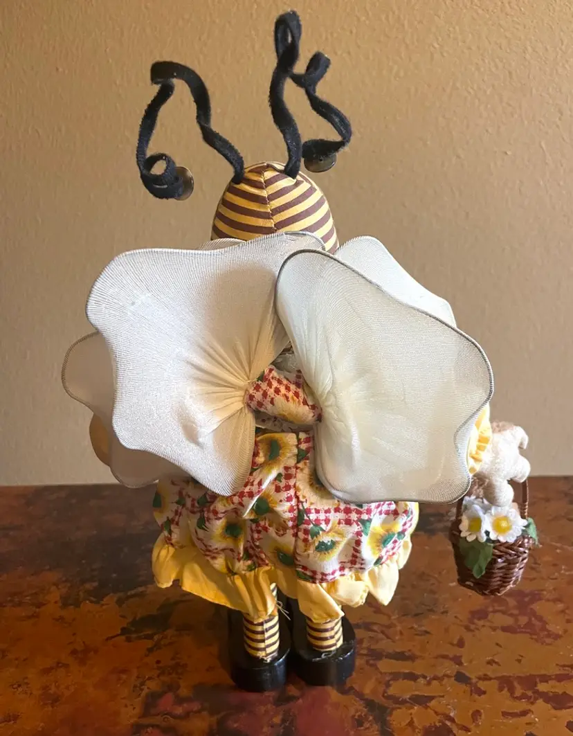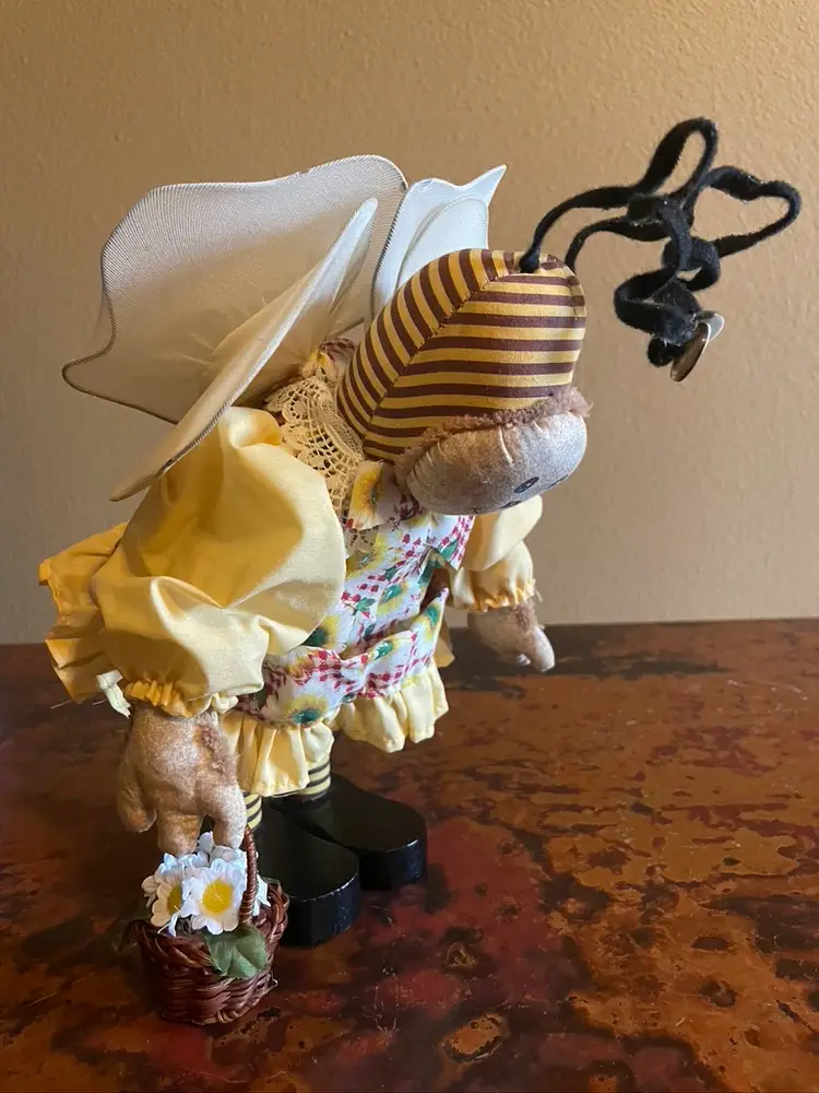 Stands 12" tall. Bends at waist. Slight wear on a wing. Wooden legs and shoes.